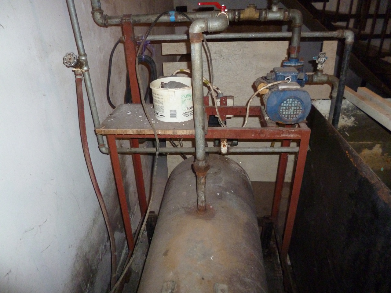 Vásároltam egy ingatlant, több mint egy éve. azt tudtam hogy a pincében van egy kút lefúrva de nem igazán foglalkoztam vele. Igazából nem is érdekelt, mert a háztól teljesen független. Néhány hete elkezdett a dolog foglalkoztatni, hogy mi is lehet az a nagy vas a pincében. Én jelenleg külföldön dolgozok, évente kb5-6 hetet töltök otthon. De mivel hamarosan költözünk haza, érdekel mi is ez pontosan. Mivel sikerült a gépen beállítani az orosz betűket kiderült hogy egy zil-130 kompresszora van összekötve egy villanymotorral. ez hozza fel a vizet a kútból 1 nagy tartályba, ahonnan egy hidrofor kiszívja és viszi tovább a kerti vezetékbe. A hidrofor ágába be van még kötve agy nagy tartály melyen nyomásóra és nyomáskapcsoló is van. Én a nagy tartály alján kinyitottam a csapot, melyből víz távozott. Közben rájöttem hogy ez kondenzvíz volt.ű