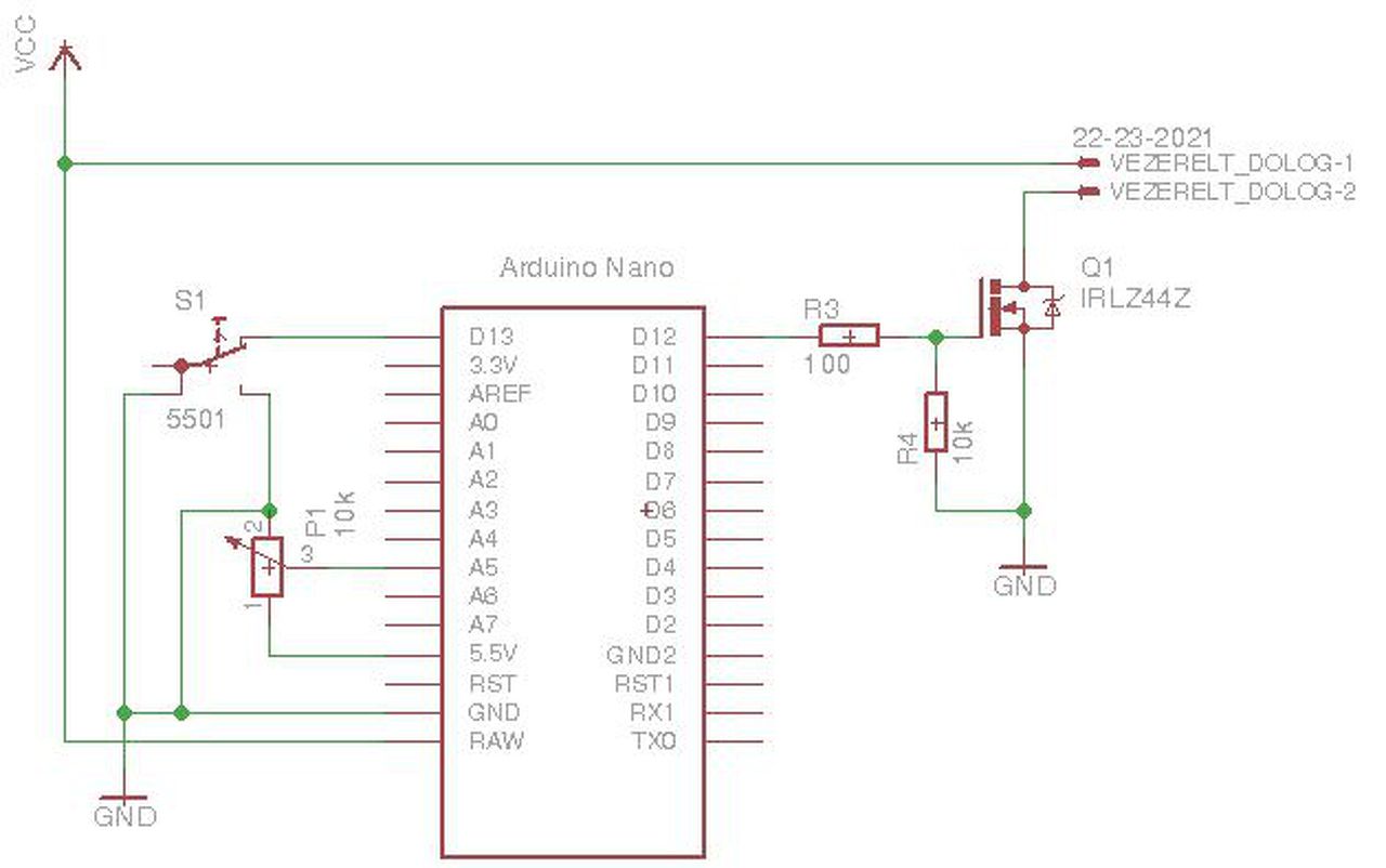 Kell még hozzá egy poti (mondjuk 10k), egy nyomógomb és egy logikai FET (pl. IRL540), persze a terhelőáramot tudni kellene. Az arduino Vin pin-je működik 12V-ról, a lapon található feszstab elég. A potit 5V és a föld közé kötöd, a középső lába megy egy analóg lábra. A nyomógombot egy felhúzóellenállással (akár a belső is használható) felhúzott digitális láb és a föld közé kötöd. Ezek a lábak bemenetek. A FET (ami IRL540 esetén N csatornás) a föld és a terhelés negatív lába közé kerül, a gate-et egy digitális pin-nel kapcsolod, ami outputra van konfigurálva. Pin és gate közé 100 Ohm, gate és föld közé 10k ellenállás. Maga a program egyszerű, periodikusan kiolvassa a potira kötött bemenetet, ehhez rendel egy másodperc értéket (0-1024 -> 1-200 sec). Ha a nyomógombos bemenet magas helyett alacsonyra kerül, akkor a fenti másodperc értékig felkapcsolja a FET gate kimenetet, aztán le. Én tennék mellé egy 1 dolláros panelvoltmérőt is, ez mutatná hogy mire van a poti beállítva. Ennek a mérő bemenete lehet akár egy 33k-22k osztóval közvetlenül a poti kimenetről is, de használhatod az arduino egy pwm kimenetét is (akár egy aluláteresztő szűrővel), amin 0-2V közötti feszt 0-40% közötti kitöltéssel állítasz be. Szerk: vagy egy rendes 1602-es kijelzőt. A hozzászólás módosítva: Szept 23, 2017