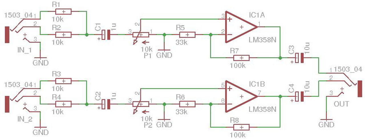 Kérlek véleményezzétek ezt a rajzot. A cél két stereo jelforrás (fülhallgatókimenet) monóra keverése és egy fejhallgató 1-1 csatornájára eljuttatni.