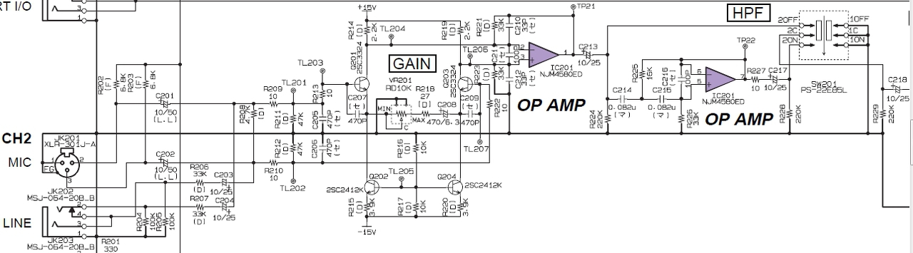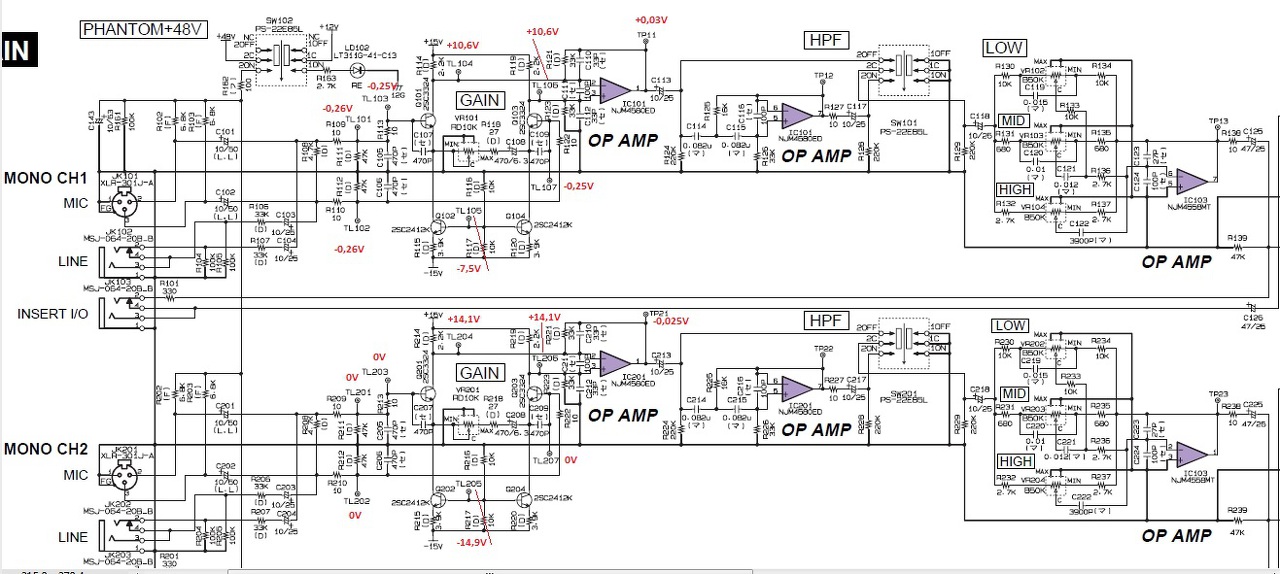 Mivel keverőről van szó szerencsére van összehasonlítási alapom mert az 1-es csatorna jó a kettes viszont nem működik. Az IC-t NJM4580-at kicseréltem de továbbra sem szól, amit találtam az nagyon érdekes: ha R217 két végpontjára rámérek az összes csatornán 5,6KOhmot mérek (pedig 10K az ellenállás) de a rossz kettes csatornán ezen az ellenálláson 10K-t mérek!