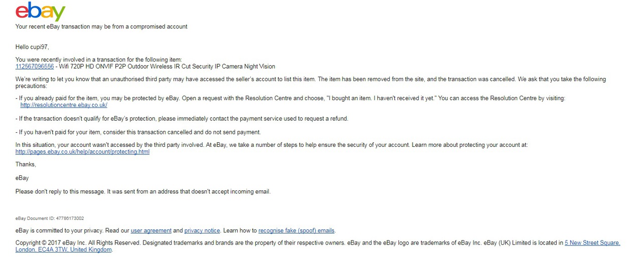 Belépsz ebay-en, megnézed a tranzakciót, indítasz egy case-t. A levélbeli linkek közül egyikre se kattints, az a biztos.