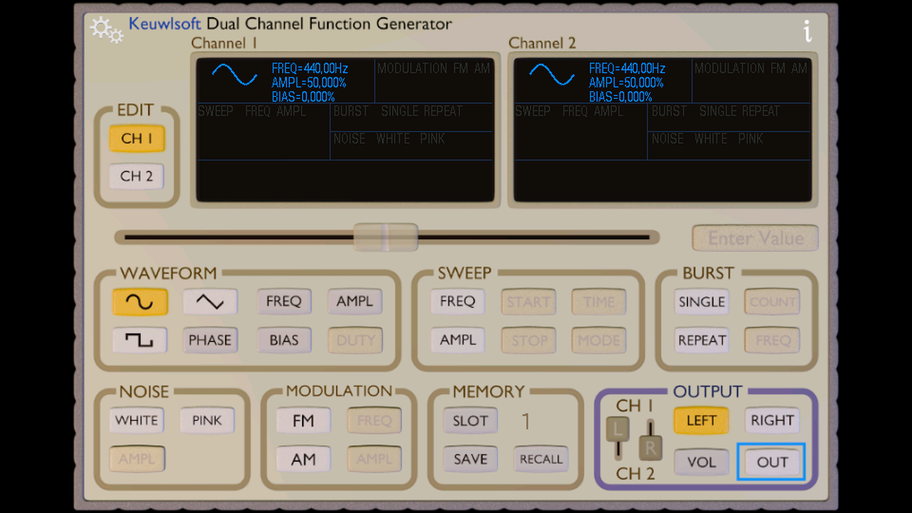 Ha nincs otthon generátorod, akkor számítógépről is tudsz szinuszt adni a bemenetre. Úgy azért már sokkal jobban tudod vizsgálni az áramköröd. Én pl. szívesen használom ezt az oldalt, ha épp nincs a gépre semmilyen generátor progi telepítve: Online tone generator