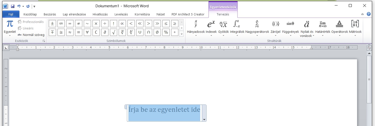 A képlethez már kell némi hozzáértés, de az is megszerezhető 4-5 perc alatt. Ehhez az egyenlet ikon kell, és ott az új egyenlet. Addig kell eljutni, hogy felül a menüsor végén megjelenjen a képletszerkesztő. Ezt értelem szerűen használva gyakorlatilag minden matematikai összefüggés leírható.