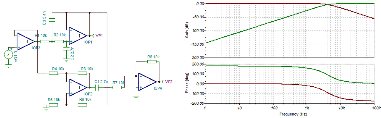 Ami a hangváltót illeti, gyakorlati tapasztalatom a 2.1 rendszerekkel van. Nekem a kivonó kapcsolás vált be. Mint a mellékelt ábra mutatja a két csatorna fázismenete teljesen fedi egymást (a zöld görbe takarja a pirosat).