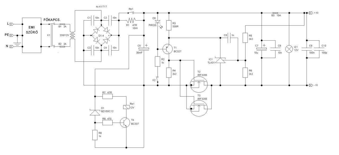 Ezért az egyik ellenállás a panelbe nincs beültetve, csak hátulról van felforrasztva. Amúgy szépen működik, most hirtelen egy 12V-os szofia izzó volt kéznél azzal próbáltam. A nagyáramú részt is véglegesre szereltem, nem spórolva a keresztmetszetekkel. Ami még eszembe jutott. Én a TL431 számára a tápot a kimeneti kapocsról vezettem vissza, kiküszöbölve ezzel a vezetékeken eső feszültséget. Viszont ha a kimeneti biztosíték (B3) kiég akkor vajon mi fog történni? Elvileg megpróbál a táp felfelé szabályozni és "megszalad" (szerintem). Ha ez így van akkor a referencia pontot átteszem a biztosíték elé.