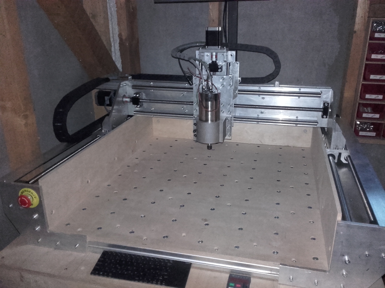 Helyére került a cnc gépem. 600x600x100 mm-es munkaterület, 1,5kW-os, vízhűtéses marómotor, 2,8 Nm-es léptetőmotorok. A vezérlés egy számítógépházba került bele. A marómotor hőmérsékletét NTC-figyeli, és kapcsolja a vízhűtést. Teljességében saját tervezés, minden mechanikai alkatrészt magam "faragtam" ki.