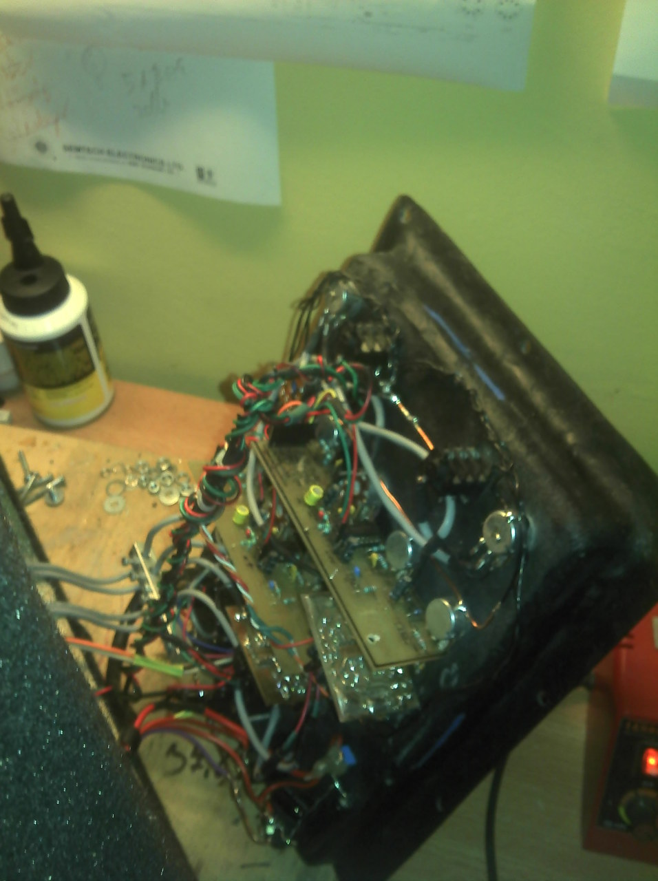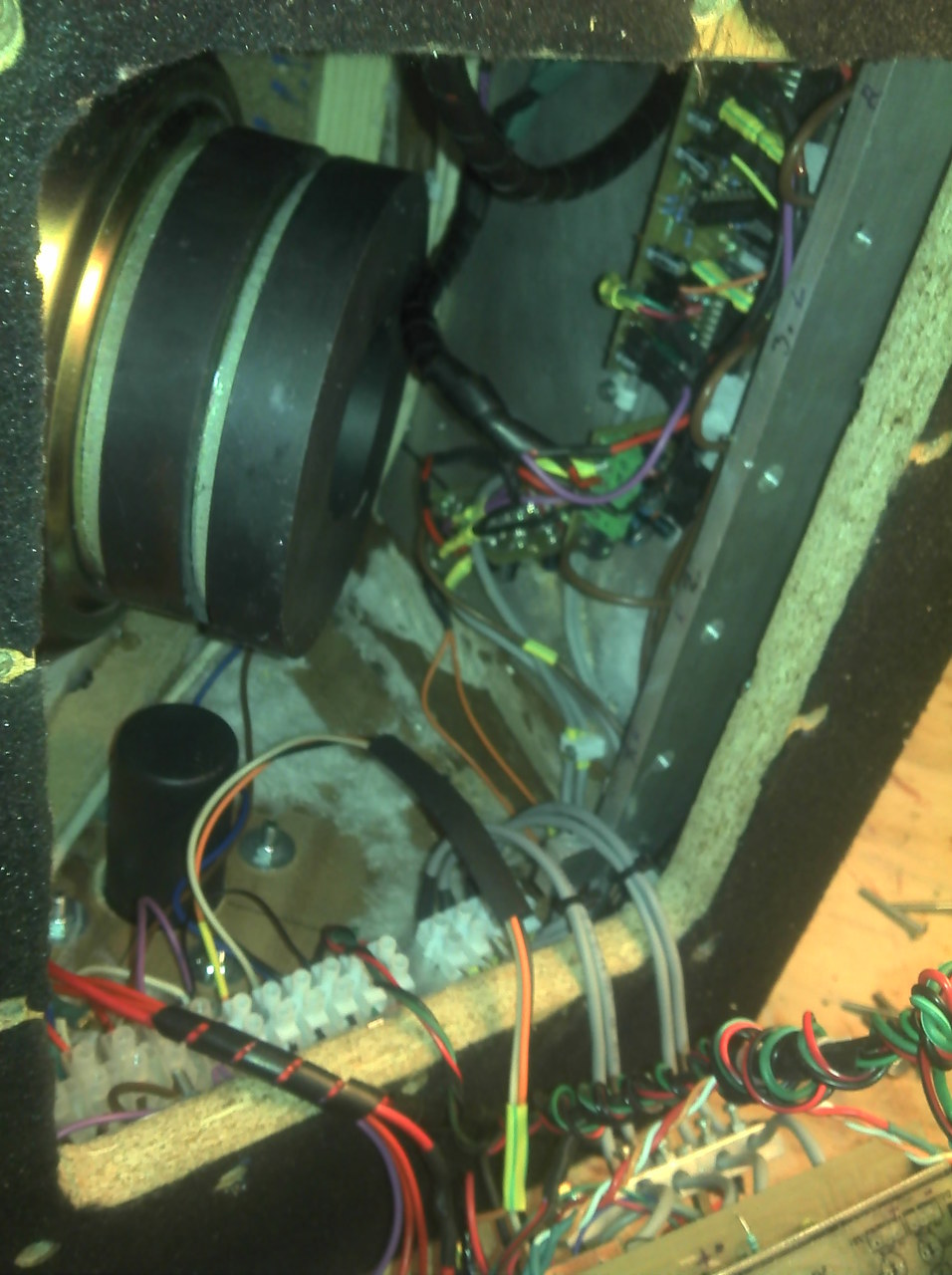 Elkészült a TDA erősítő Béta verziója. Sikerült a nagyfrekis gerjedést megszüntetnem. A problémát egy hangszóró nélkül bekötött magas sugárzó hangváltója okozta. Az első képen látszik egy sorkapocs sorozat. Annak a panelnak az aljára ami a kapcsokat tartja van felfogatva egy harmadrendű sávszűrő. Ez kb 3 cm kábellel a piros vezetékeket rögzítő sorkapcsok egyikébe csatlakozott. Ha ezt a hangváltót rákötöttem a magasra megszűnt a gerjedés, vagy 3m hangszóró kábel után kötöttem magas nélkül. Egyébként gerjedt és meg is ölt pár IC-t. Ezt leszámítva a rendszer jól működik most. A trafó zaj elég magas és 200mA a nyugalmi árama a 4 panelnek. Milyen kábelezési stratégia lenne a legjobb ebben az esetben? Jelenleg ha a hangerő potik fél állásban vannak, akkor a legkisebb a zaj. A két szélső állásban növekszik valamelyest. Hurok elvileg készakarva nincs bent. Ha bár a panoráma elve GND-vel halkít nullára egy csatornát. De nem tudom....