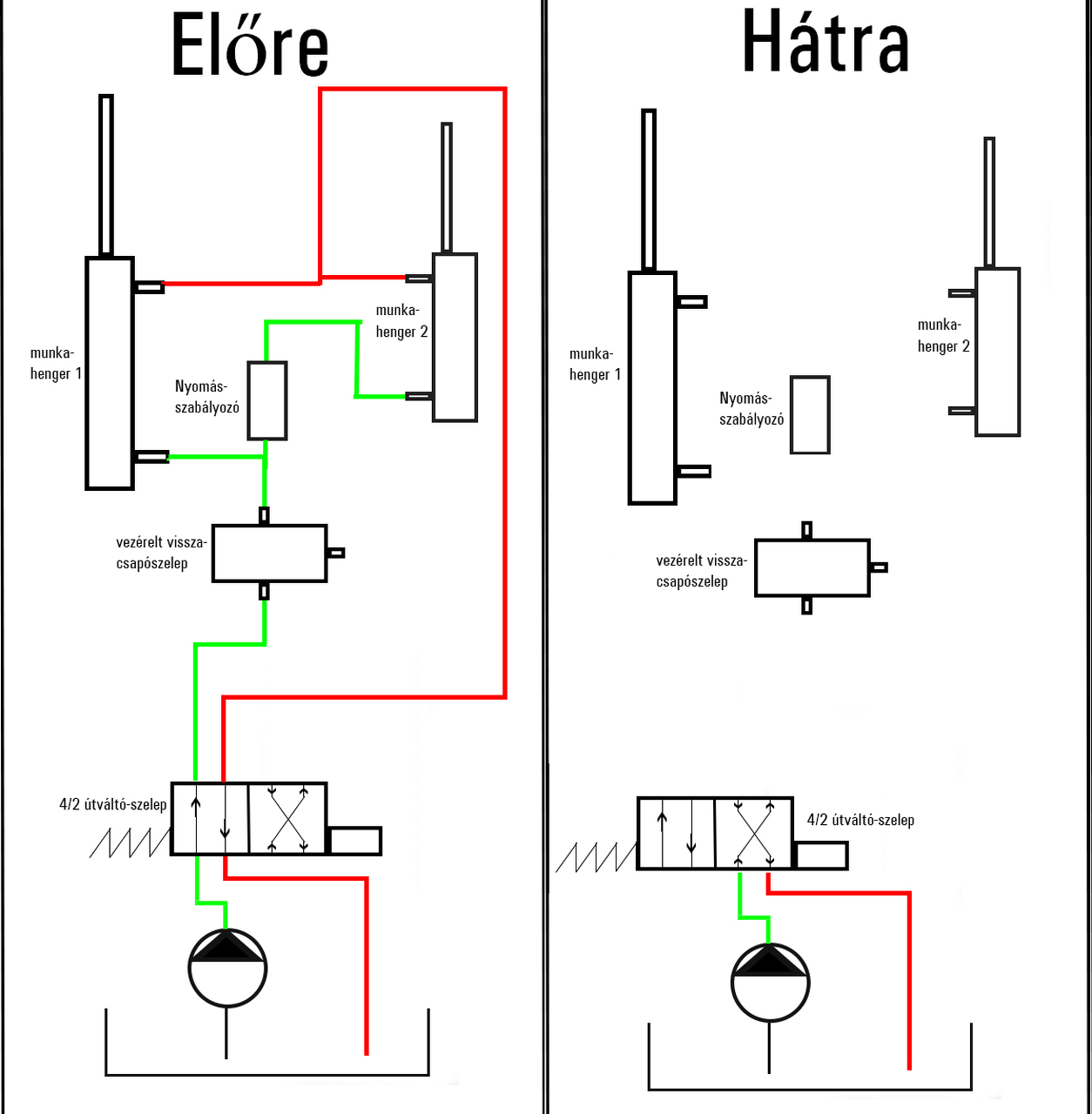 A 4/3as útváltó szelepek alapjáraton üresben vannak (tehát közép). Az elöre haladó folyamat (bal oldali ábra) úgy kezdödik hogy a bal oldali 4/3-as útváltó szelep átkapcsol balra (szval. elöre/nyomás). Amint elérte az elsö munkahenger a végállását a nyomáskapcsoló átkapcsolja a jobb oldali útvaltó szelepet balra és a második munkahenger is elöre halad. Majd végállásnál üresbe rakja az útváltó szelepeket és lekapcsolja a pumpát.