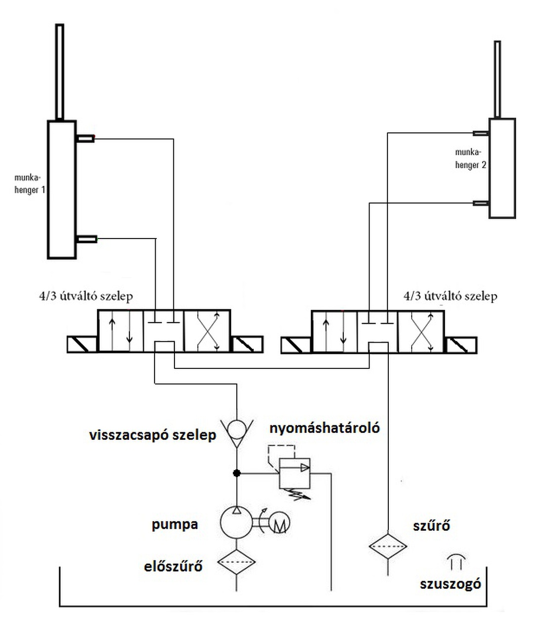 Legolcsóbb és egyszerűbb megoldás két 4/3as elektromágneses szelep. Ezek külön külön vezérlik a két hengert. Ha egyik sem üzemel, akkor körbeforgatja az olajt a szivattyú. (egyszerre csak egy funkció). Nyomáshatároló, szűrő hol van?