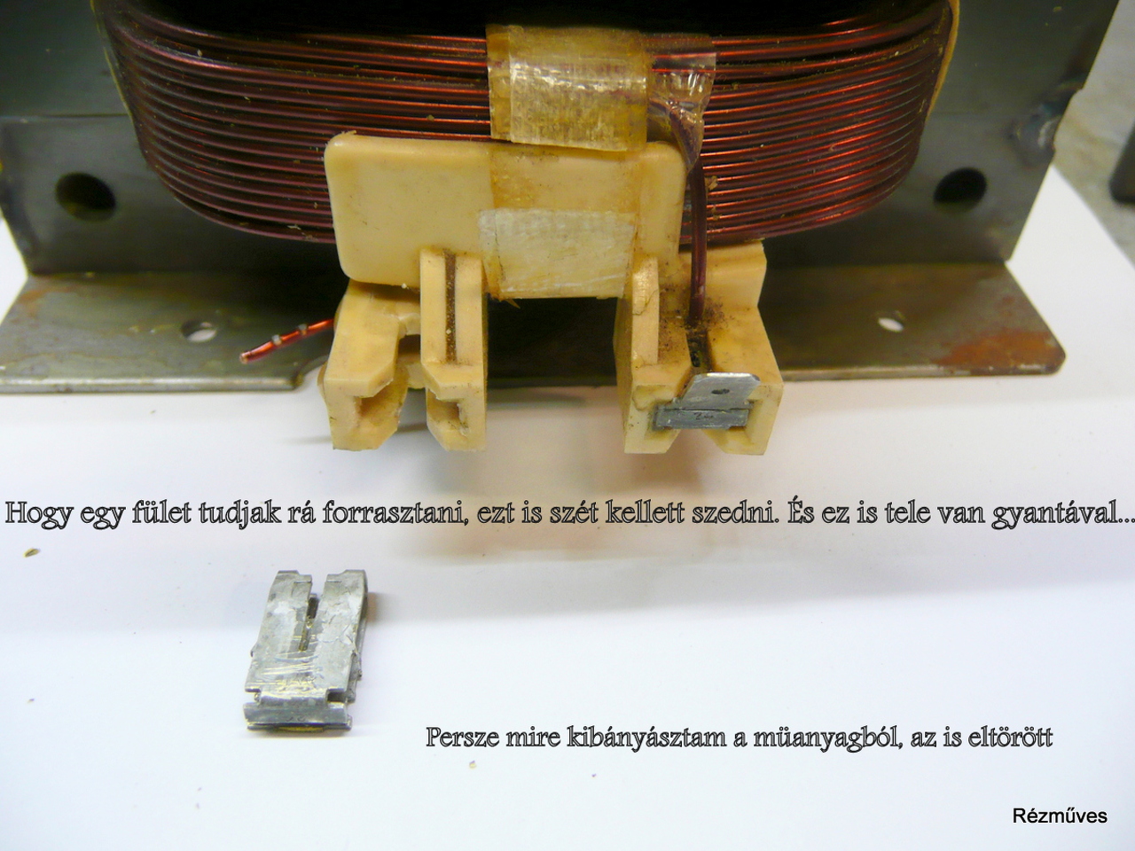 Csak amikor kibontottam, akkor láttam, hogy az egyik rátűzős csatlakozó fül, le van törve. Persze a 220-ról. Na szuper, rögtön "bűvészkedéssel" kellett kezdeni, mert az pont az alsó szálé és alig lehet hozzáférni. Úgy döntöttem, hogy kiveszem azt a fémet és kint ráforrasztok egy fület és úgy rakom vissza, ahogy volt. Csakhogy abból a műanyagból kibányászni szinte lehetetlen a törés veszélye nélkül, mert az is be van öntve valami gyantával. Persze el is törött, de talán össze tudom gyógyítani. (egy vérbeli modellezőnek nincs lehetetlen)...