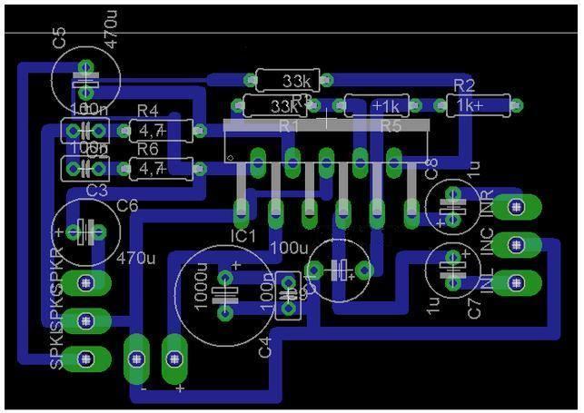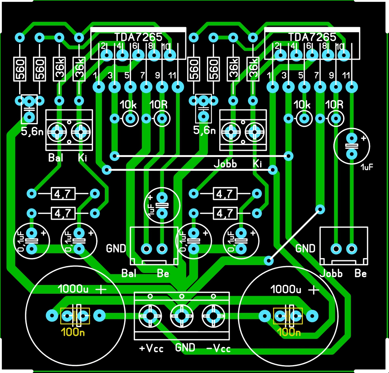 A pozitív tápot az 1000 µF lábáról vinném az IC-k felé, nem közvetlenül a +Vcc csatlakozási pontról, így hatásosabb lenne a szűrés. |