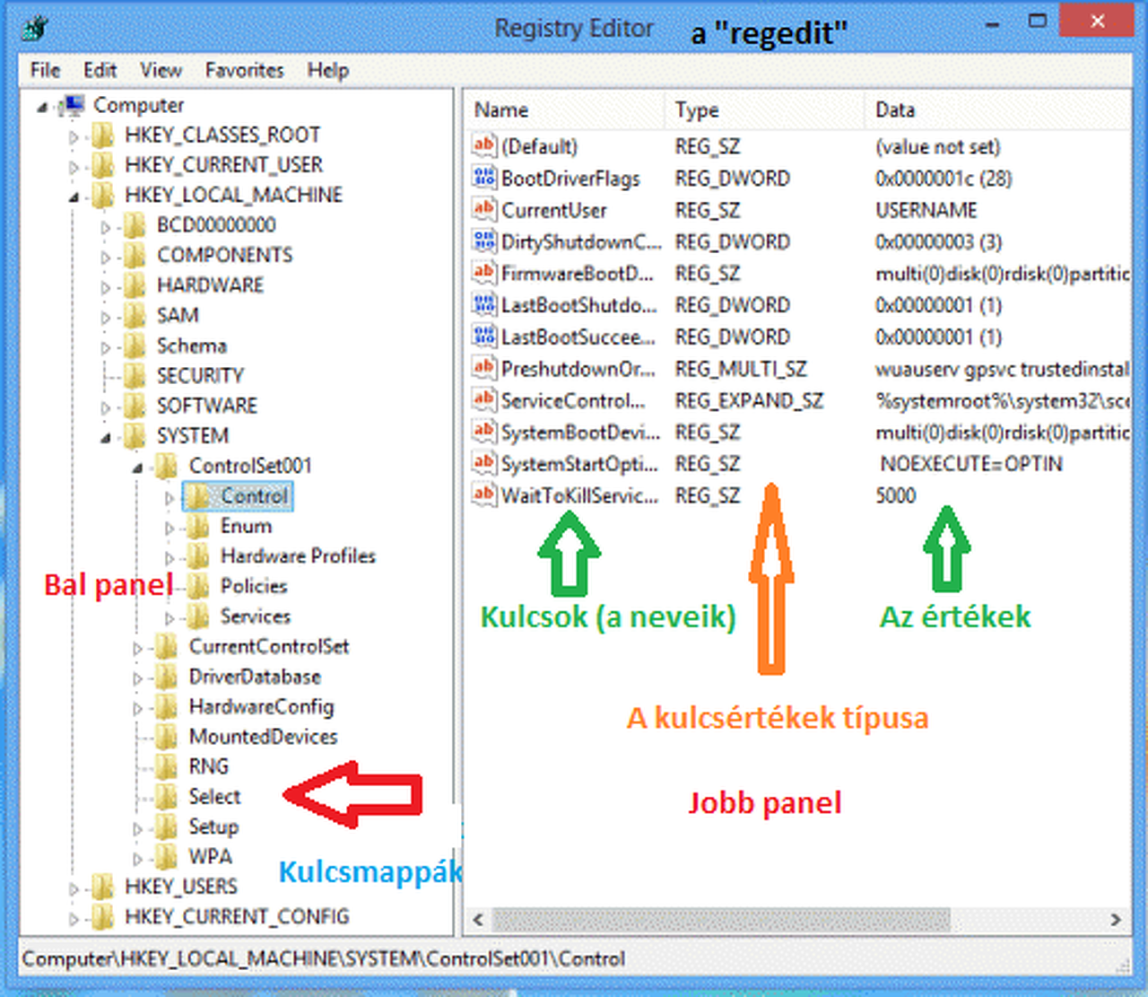 Erre a kívánt kulcsmappára (Driver Signing) egy bal klikk, ezzel kiválasztod. Ekkor a regedit jobb oldali paneljében megjelenik a tartalma. Nekem Win10-em van, abban így nem szerepel, ezért konkrét képet nem tudok adni róla. De mellékelek egy kis képet a fogalmak helyrerakásához.