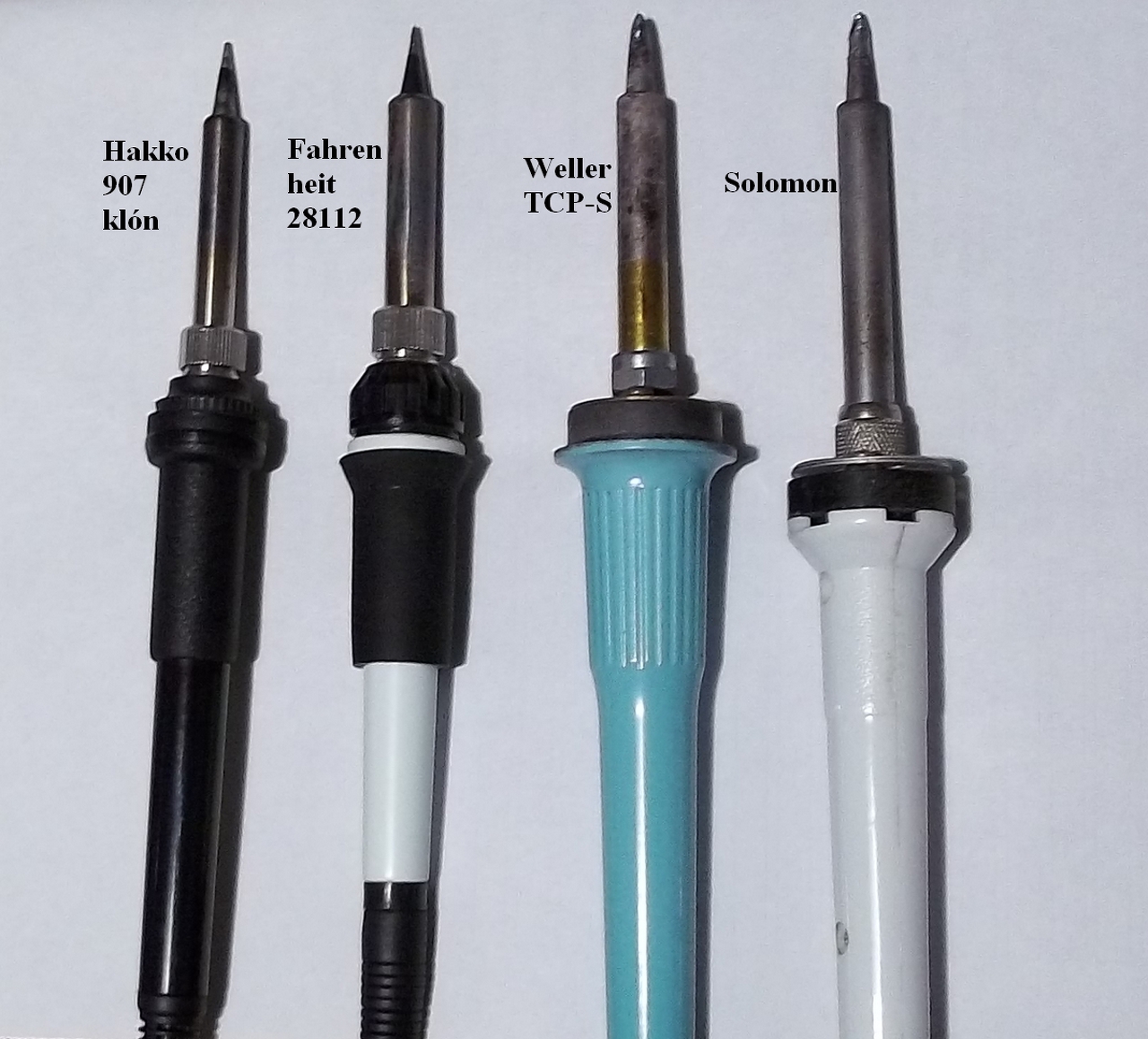 Aztán van olyan nyák, hogy a beültetéskor 3 féle heggyel is dolgozom az alkatrészek függvényében, és elég macerás a hegyeket csereberélni pláne üzem melegen. Sokkal egyszerűbb csak odanyúlni a másik pákáért, vagy ha nincs plusz állomás akkor átdugni és átkapcsolni egy kapcsolót, mint csereberélni a hegyeket. Ez ne érne meg pluszban egy 3-4000Ft-os pákát (mert kb. annyi egy solomon), meg hozzá egy 2000Ft-os hegyet? A kommersz páka is jó a legtöbb célra, de az SMD-hez kényelmetlen mert hosszú, főleg ha nagyító alatt kell dolgozni. Erre a célra kell az Ersa vagy hasonló amiket írtam, hogy mennyire jók azok a hakko klónok az majd kiderül ha megjött és kipróbáltam. De a solomonnal ugyanúgy meg tudod forrasztani az SMD-t is... És akkor a hegyek és a méretek. A képre odaírtam minden páka mellé a típust. A legjobb minőségű hegye a weller-nek van. A solomon-é már vacakabb, de azzal még aránylag el lehet forrasztgatni. A Fahrenheit-é még rosszabb, az már határeset, a hegyessel nem is lehet dolgozni csak a vastagabbakkal, úgy ahogy. A Hakko klón hegye meg konkrétan selejt, nem tesz neki jót a hő. Kipróbáltam azt hogy nem fűtöm fel a pákát, hanem egy másik pákával felónozom a hegyet, és csak utána fűtöm fel. Az előónozás ment is szépen, tapadt a hegyre az ón úgy ahogy kell. Egészen addig amíg fel nem lett fűtve, mert utána már színt váltott a hegy, az ón pedig már nem akart tapadni hozzá...Tettem fel régebben talán ebbe a topikba egy szabályozó rajzot, az bármelyik pákához jó, a hőelemeshez és a termisztoroshoz is. Hogy az Ersa milyen azt meg nem mondom, de biztos hogy menne ezzel a szabályozóval, ahogy megy a solomon, a klón hakko és a fahrenheit is.