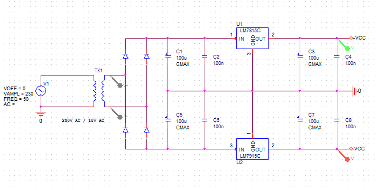 Segéd tápfeszültséget szeretnék szimulálni, de nem az igazi. Van otthon egy 230V/18V-os hálózati trafóm, 10VA-es, és LM7815-ös és LM7915-ös IC-m. A trafónak egy szekunder tekercse van. Próbálgatok kihozni valahogy egy olyan kapcsolást, ami lehetővé teszi a kimeneten a +-15VDC-t. Itt egy elképzelés. Fogjuk rá, működik. Igaz, 8V-ot ot és nem 15-öt csinál. Jó lehet ez? Valaki, aki rutinosabb a témában, rá tudna nézni nekem? Vezérlő IC-nek, a félhíd meghajtónak és a műveleti erősítőknek kellene a +-15V. Köszönöm! Üdv, Bence!