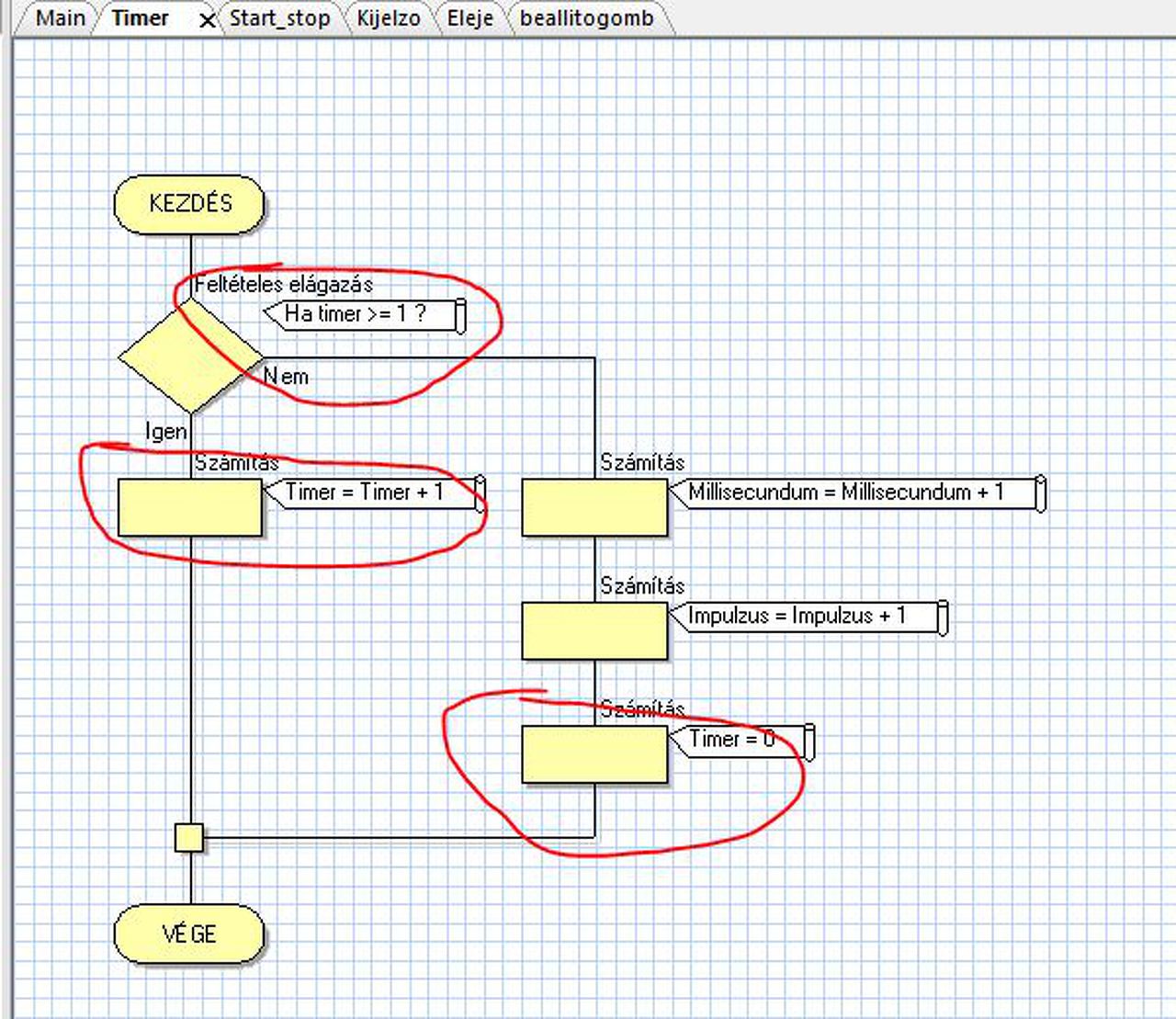 A timer ről kérdeztél arra válaszoltam , ott van az elágazás és a nem ágra fut a >=1 parancs az igen ágon meg számol De MIT ? Ha a nem ágon nagyobb vagy egyenlő egy akkor az igen ágon az ellenkezője tehát kisebb mint 1 akkor így 0 nál hozzáad egyet amit azonnal nulláz a másik ágon ...