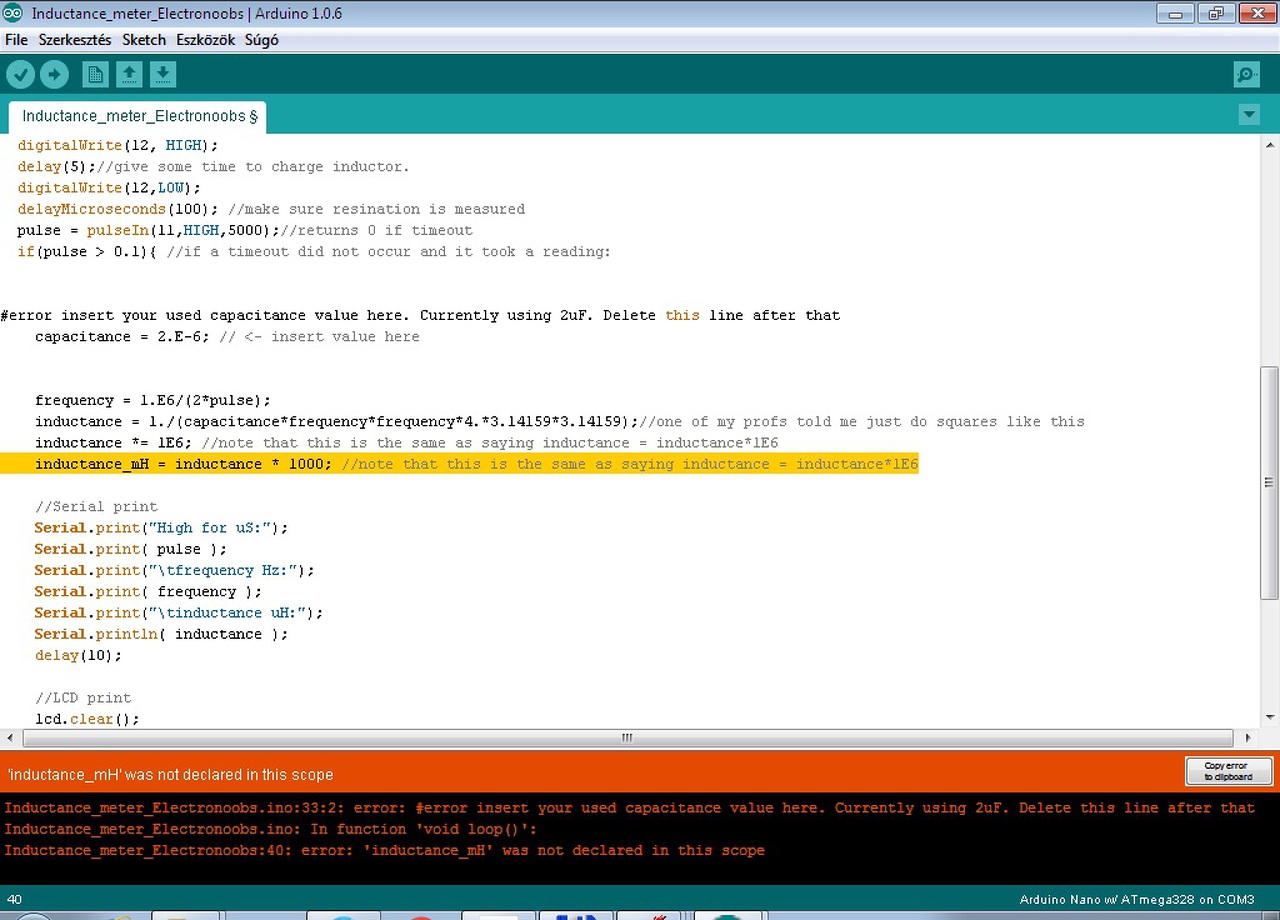 Egyrészt a #error kezdetű sort törölni kell, miután a következőben átjavítottad a kondenzátor értékét az általad használtra, ezt is jelenti az a sor angolul. Másrészt a linkelt kódban az inductance_mH kezdetű sor nincs benne, gondolom te írtad bele, de nem hoztál létre ilyen nevű változót, a void setup felé egy "unsigned long inductance_mH;" sor megteszi.
