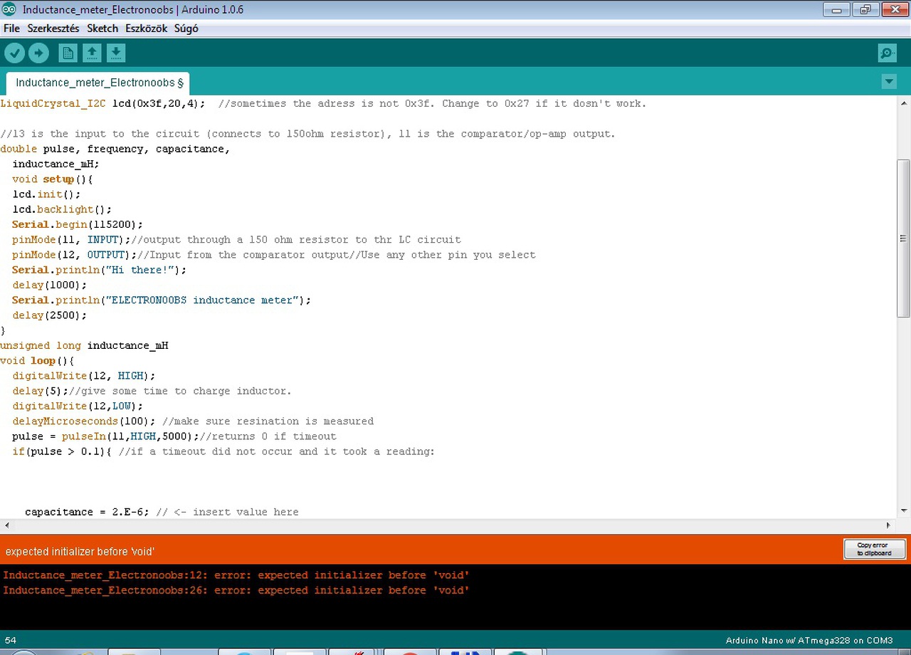 Egyrészt a #error kezdetű sort törölni kell, miután a következőben átjavítottad a kondenzátor értékét az általad használtra, ezt is jelenti az a sor angolul. Másrészt a linkelt kódban az inductance_mH kezdetű sor nincs benne, gondolom te írtad bele, de nem hoztál létre ilyen nevű változót, a void setup felé egy "unsigned long inductance_mH;" sor megteszi.
