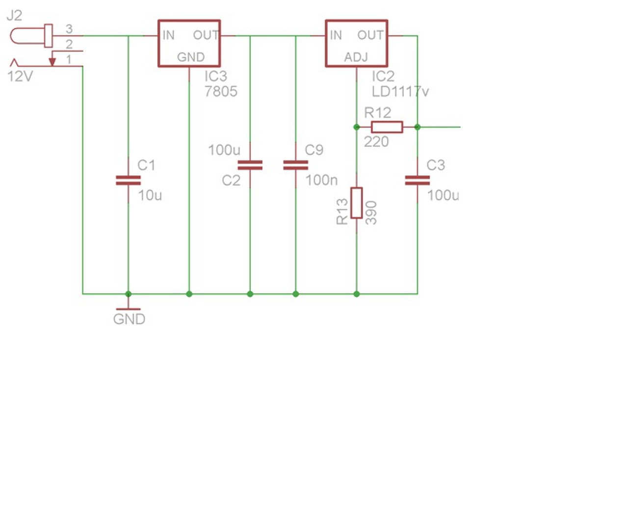 Szerintem: az out és adj(gnd nevű a 3.3V-os stab-nál) lábak közé stabilizál 3.3V-ot, tehát az R12-re, ezen az ellenálláson lesz 3.3V. 3.3V/220ohm=15mA, ez az áram fog folyni. Meg kell nézni, az adj(gnd) lábon mennyi áram folyik (stab. fogyasztása), ezt összegezni a 15mA-rel, majd feszültséget számolni R13-n. Ekkor tudod a két ellenálláson jelen levő feszültséget, ezeket összeadva megkapod mennyi lenne a kimeneten a feszültség. A 7805 természetesen korlátoz, csak úgy, mint a 3.3V-oa stab drop-ja is levonódik. De a korrekt válasz, hogy ki kell venni az ellenállásokat, R13 helyét pedig rövidre kell zárni.