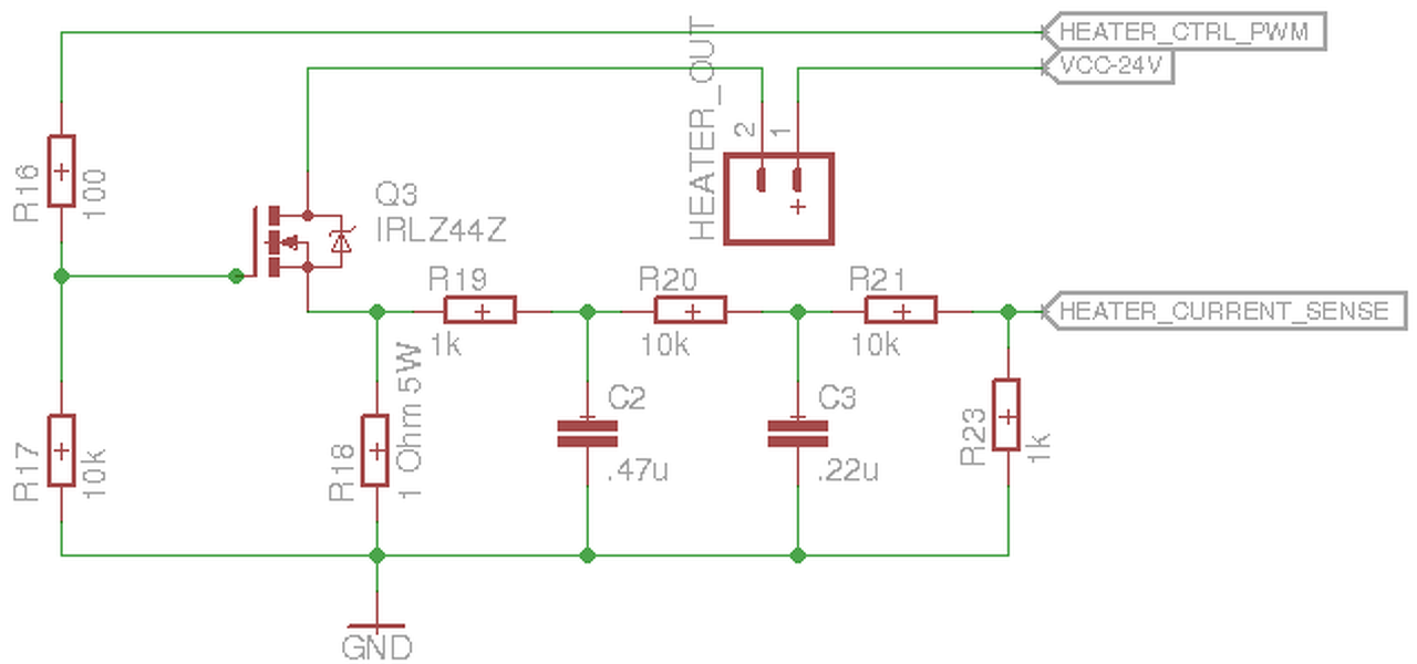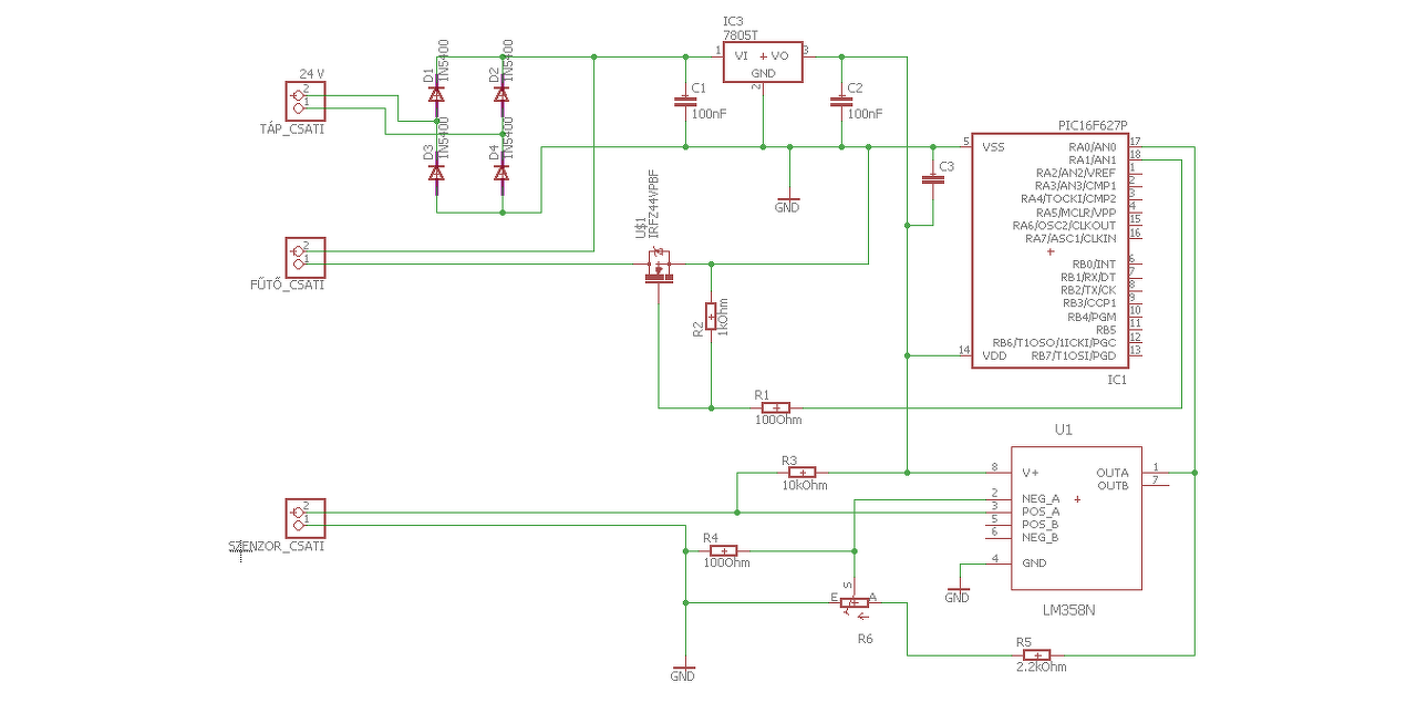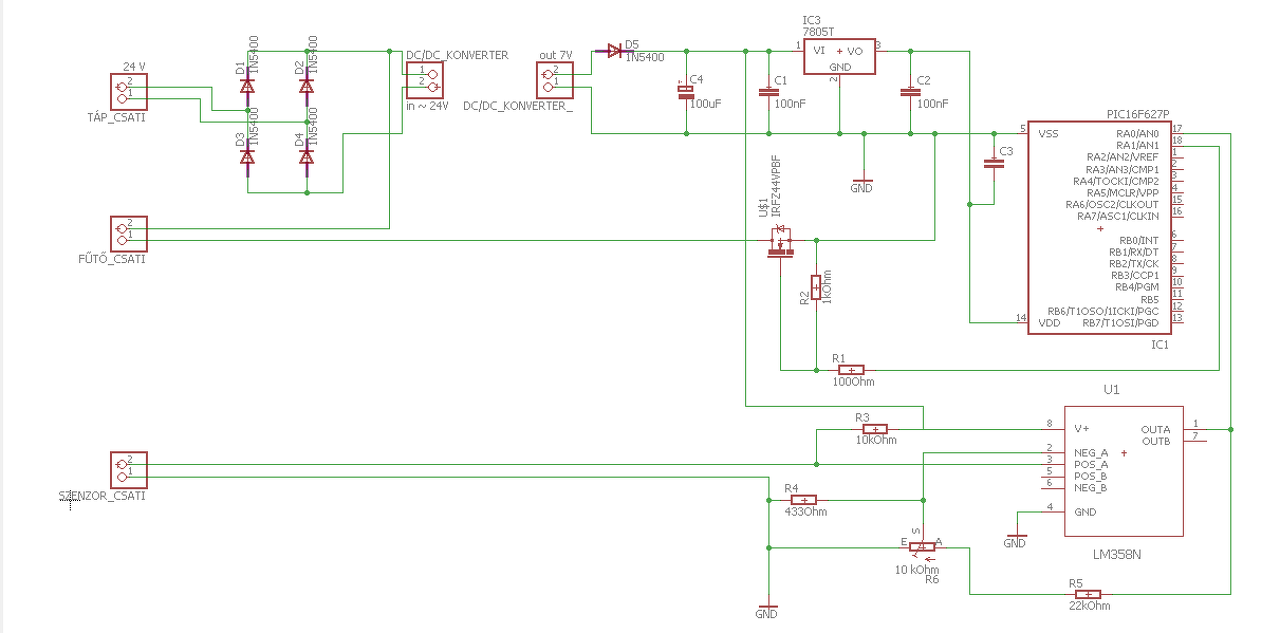 Akár jó is lehet, de pár dolgot módosítanod kell. Pl ha hidegen rákapcsolod a mosfet-et a fűtőbetétre, az akkor rövidzár szerű állapot lesz és mivel kicsi kondenzátorokat raktál fel, nem kap majd a PIC-ed elég áramot a működéshez, így le fog kapcsolni, ami által elengedi a mosfet-et és kezdődik minden elölről. Tegyél egy diódát sorban majd egy nagyobb kondenzátort a regulátor elé. Amúgy sok lesz a 24V -> 5V, érdemesebb egy step down konverterrel elvégeztetni ezt a feszültség csökkentést. A kis kondenzátorokat minél közelebb rakd majd a PIC-hez és az opamp mellé is érdemes rakni. A 358-as nem rail to rail, így ha 5V-ot kap majd csak 3.9V-ig fog értéket adni az erősítés után, szokták úgy, hogy nagyobb feszültséget kap, pl 7V-ot és akkor 5V-ig fog erősíteni, így nagyobb lehet az érzékenysége, persze csak akkor, ha ez cél.