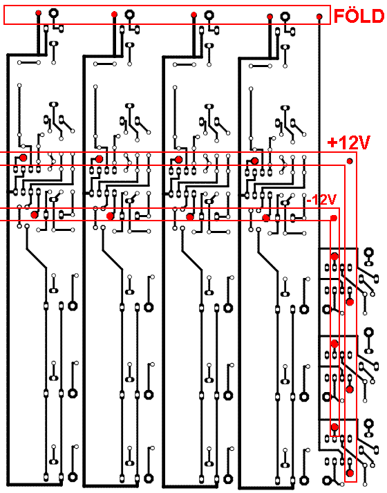 Az egész panel az aljától kb 1-1,5cm-re lenne, és a gyűjtő (szószerint) sínekre rövid árnyékolt vezetékeken keresztül vezetném a sávokból. Mint látható a sávokat külön modulokként szerelem, tehát külön kivehető mindegyik.
