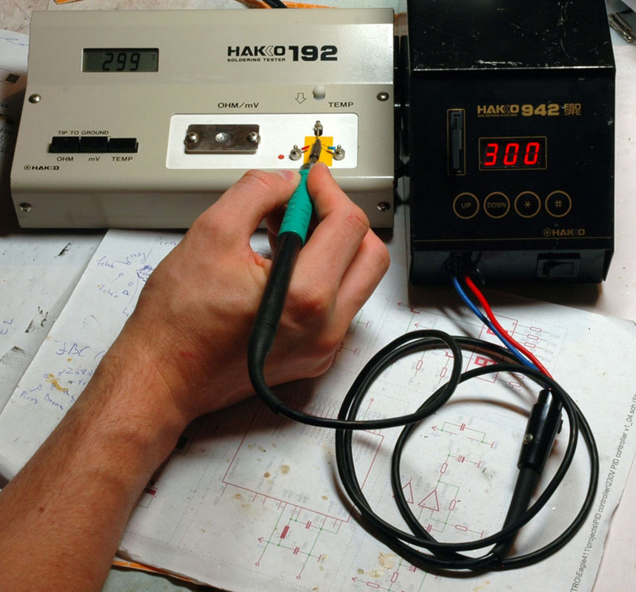 Idézet: A rajzot én készítettem és helyes, de igaz, hogy egyszerűsítve van.„Ha mégsem így van, akkor nem tud rajzolni aki ezt rajzolta.” Ezért itt egy új, ami részletesebb. Idézet: Ezért írom most le (újra).„sokan használják ezt a pákát (meg a JBC-t is), érdemi infót mégsem tud adni senki egy nyamvadt hegy bekötéséről, beszélnek összevissza.” JBC, Hakko, Pace, Weller 3 csatlakozós egybeépített pákahegyei mind ugyanúgy működnek. (Nem a felépítésük azonos, hanem a működésük.) Az alábbi képen egy JBC pákát hajtottam Hakko állomással, és jól láthatóan csak 2 vezeték csatlakozik. Ugyan azon a két vezetéken megy a fűtés (AC vagy DC mindegy) és a hőmérés is. A hőelem sorosan van a fűtőbetéttel. Ezt nem úgy kell elképzelni, hogy bele tettek még egy hőelemet is, hanem a CN3 odavezetés és a fűtőbetét csatlakozása hoz létre egy hőelemet (TC1). Ugye a hőelem úgy jön létre, hogy megfelelő anyagokat/ötvözeteket kötsz össze. A harmadik vezeték csak az ESD földelésre van kialakítva. A JBC-nél a CN1 és a CN3 össze van kötve a hegyen belül, ami egy újabb (felesleges) hőelemet (TC2) hoz létre, és ezért gondolják sokan, hogy a CN1 a közös pont. De ez egy hibás megközelítés... szívesen megmérném egy ilyen DIY vezérlővel a pákahegyen a feszültséget.