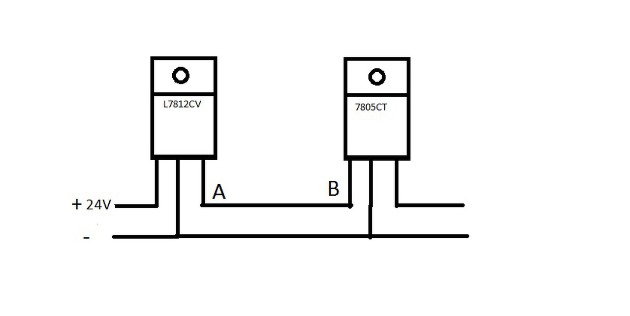 Sziasztok. Kellene egy kis segítség. Van egy PIC-el összerakott áramköröm amiben sorba van rakva egy L7812CL és egy 7805CT stab IC. Az áramkör 24 voltról megy. Van benne egy piezó sziréna ami 12 voltos. A PIC kapja az 5 voltot. Raktam már össze 3 darabot és működnek is. Most csináltam újabb paneleket, és PIC nélkül tápra rakva a 7812-röl csak 6 volt jön le, a 7805-ről már csak négy. Azt hittem panel hiba. Kiforrasztottam a 7805 kimenő lábát és terhelés nélkül hagytam lógni. Ugyan az. Kivettem a két IC és összeraktam lengőbe. Most a 12 helyet 10.3-at mérek (Rajz). Mértem őket külön tápról működik mind a kettő. A mellékelt rajzon az A és a B szakaszra ampermérőt rakva az áram felvétel 3,6 mA. Cseréltem az IC-ket , ugyan az. Ilyennel még nem találkoztam.