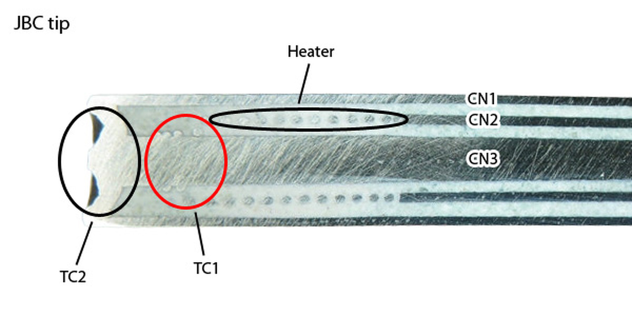A JBC-nél a CN1 és a CN3 össze van kötve a hegyen belül, ami egy újabb (felesleges) hőelemet (TC2) hoz létre, és ezért gondolják sokan, hogy a CN1 a közös pont. De ez egy hibás megközelítés... szívesen megmérném egy ilyen DIY vezérlővel a pákahegyen a feszültséget.