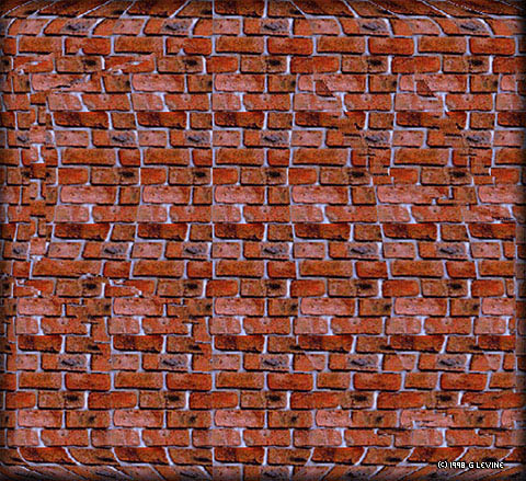 Ha ezt össze keverjük,s rosszul nézzük, teljessen más képet kapunk. Nekem Pl. a repülő úgy jelent meg mintha a háttérből kivésték volna a formáját. Jó példa erre az alul levő kép. "Távolba" nézve egy téglából kirakott gödröt látunk melynek az alján, bal felül egy kúp,jobb alúl egy tölcsér van. Bandzsítva viszont a kép "kiemelkedik" a monitorból és megfordul minden. Most bal felül a tölcsér van, és jobb alúl van a kúp. Amúgy ha az újunkat kinyujtjuk a fejünk és a monitor közötti 1/3 távolságra (a fejhez közelebb) és jó erősen nézzük a körmünk alatti "is piszkot", akkor egy idő után elő jön a kép.
