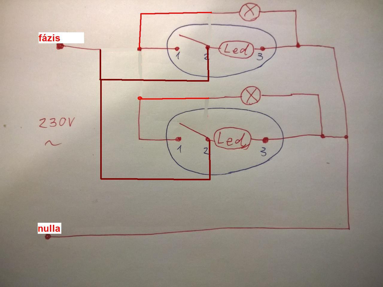 Valóbbban, az előbbi kérdéseimí gy kicsit vakon mentek, elnézést. Próbáltam valamiféleképpen lerajzolni, remélem aránylag jól sikerült. Két izzó van, külön 1-1 potméter tartozott hozzájuk. Az egyik képen az eredeti kapcsolási rajz, a másikon az van, ahogyan tudomásom szerint helyes a bekötés, akkor ha felkapcsolt állapotban akarjuk, csak hogy a led világítson, ha a rajzon lévő 1-es és 2-es jelölésnél lévő vezetékeket felcserélem, akkor világít mindig a Led, az lenne, számomra az optimális állapot, kérdés, hogy helyes-e úgy is bekötve?