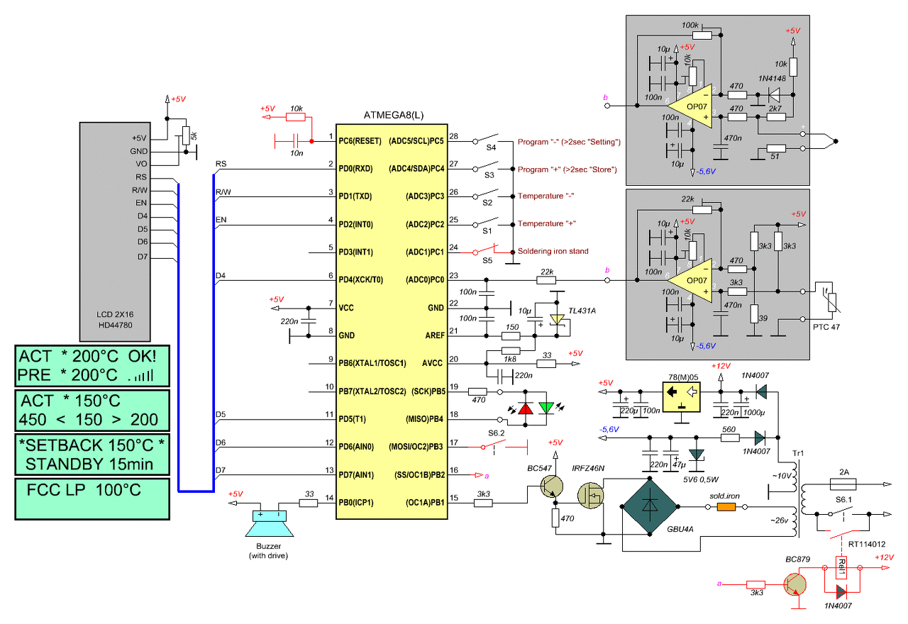 A uC vezérlésnek szerintem inkább ott van értelme, hogy tudsz az egyszerű on-off megoldáson kívül PWM-mel fűteni, tudsz PID szabályozást csinálni, már ha akarsz. Több hegy "profilját" is el tudod tárolni, nem kell minden csere után az adott hegyhez kalibrálnod a szabályozást, hanem menüben átállítod hogy most a "durung" helyett a vékony hegyest használod, és az ahhoz tartozó kompenzálást használja. Akár még több pákát is használhatsz, párhuzamosan, és csak átkapcsolod hogy most melyik van a kezedben, és akkor nem kell hegycserével sem bohóckodnod.