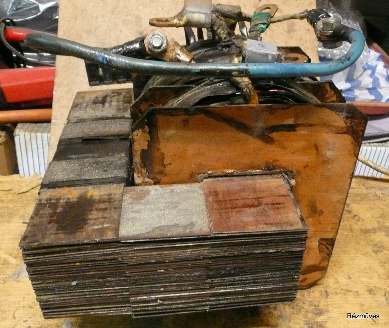 Úgy is ki lehet fűzögetni, hogy nem szeded ki a lemezeket. A szekunder nem túl sok menet, viszont kifűzögetés közben meg kell számolni. A menetszám/feszültség arányából lehet eldönteni, hogy 2 vagy 3 menet a célszerű. A méretek szerint 5-6 kW-os ponthegesztőt ki lehet hozni belőle, ami 2000-3000 A-es áramra is képes lehet. Ez már 2 db 2-es lemez összehegesztéséhez is megfelel. Nem túl nagy felületen.