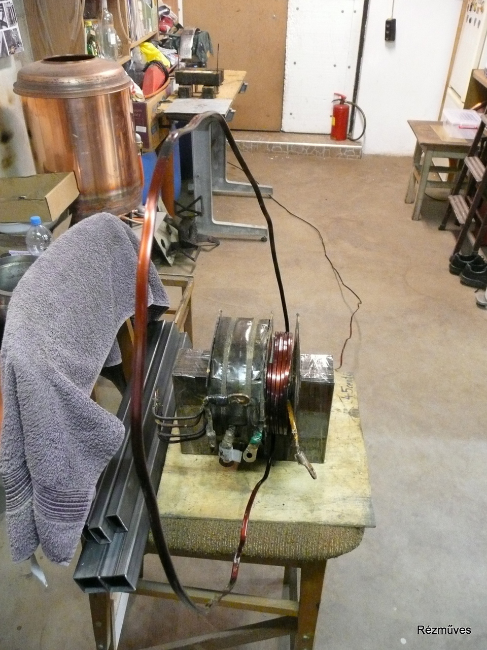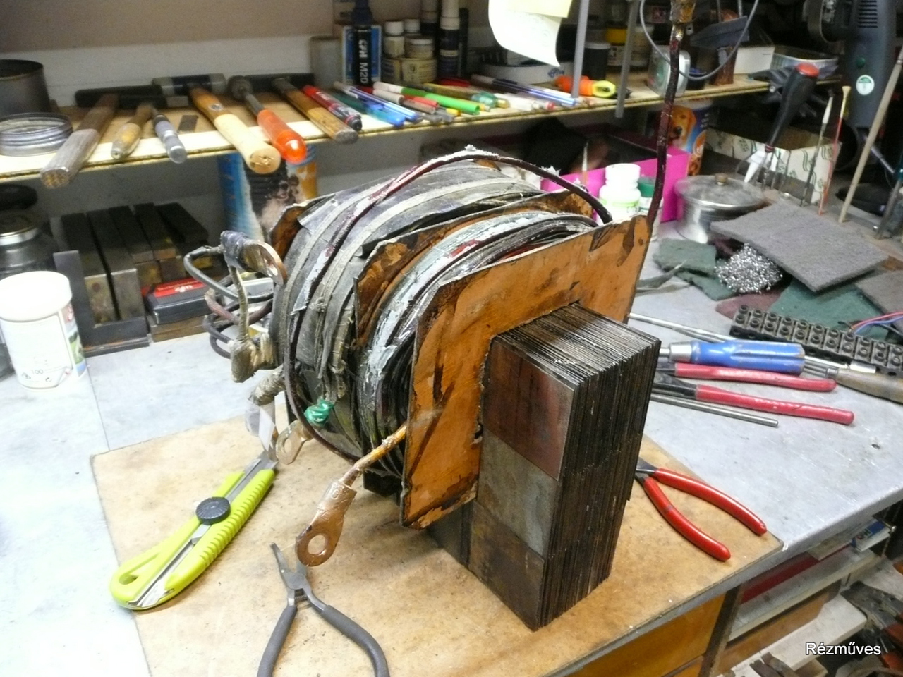 Elkezdtem a "kifűzögetést", de erre nem igazán voltam felkészülve...nem vezeték van feltekerve, hanem 6 x 3 mm-es, zománcozott vörösréz sín...elképesztő. Egy viszonylag kis alapterületű műhelyben, ahol minden tele van polcokkal, gépekkel szerszámokkal, ez nem semmi feladat...