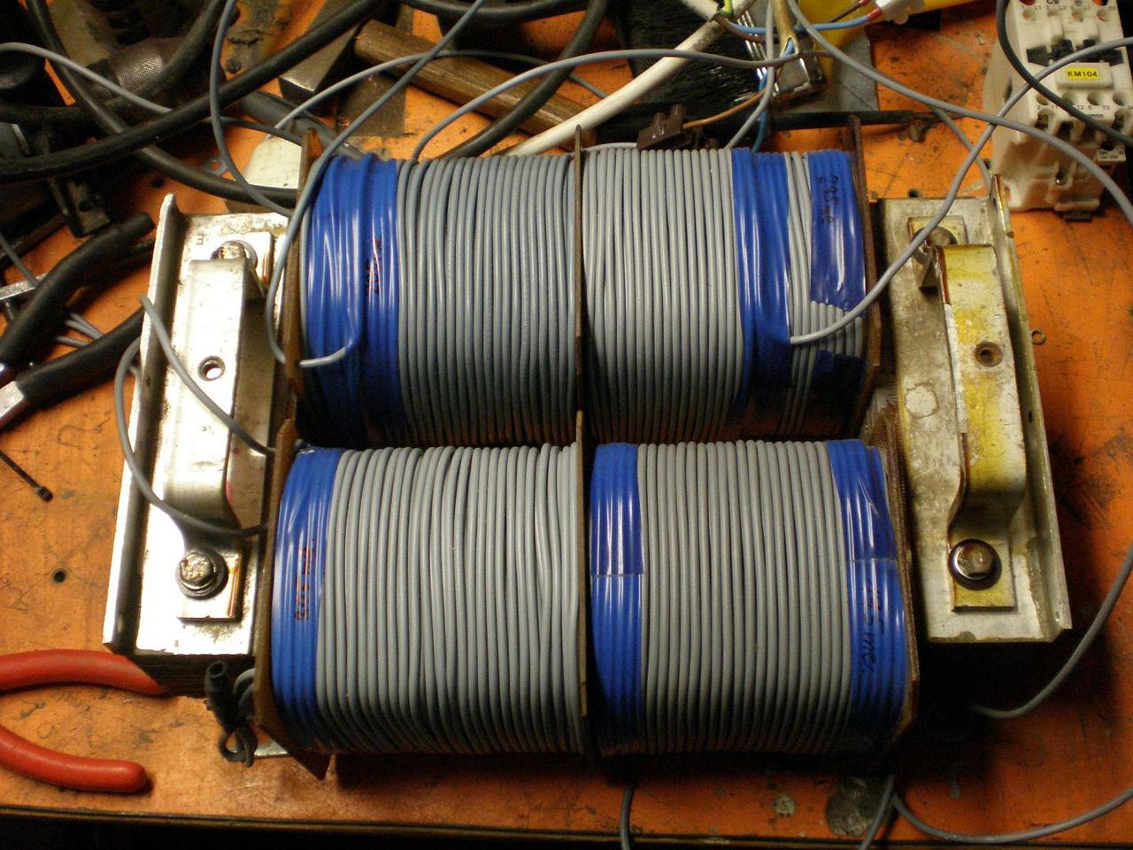 Több képeden is látszik, hogy a szélesebb tekercstest részen is van két vastag kivezetés, rajta kábelsaruval. Ez össze is van kötve a kisebb tekercstesten lévővel.