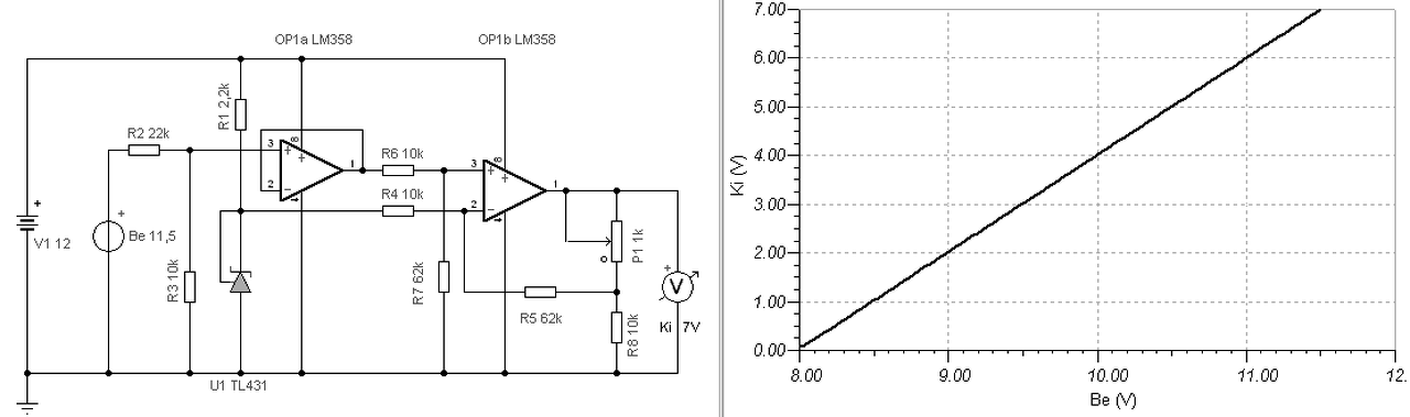 Mondjuk nem írtad mekkora tápfesz áll rendelkezésre, és hogy a 8-11,5V terhelhető-e. Egyébként a megoldás, hogy elsőként le kell vonni a 8V feszültséget a bemenő feszültségből. Majd a fennmaradó 11,5-8=3,5V feszültség változást, kétszeresére kell erősíteni. De én elsőként leosztottam a 8V-ot a 2,5V referencia szintjére és azt vontam ki. De mivel a 22k/10k osztó, a feszültség változást is leosztja, nagyobb erősítés kell, mint kettő. (A műveleti erősítő tokjában két OPA van, csak a TINA nem tartalmazza a második erősítőt. Tehát ott a lábszámozás nem jó és tápfesz sem kell kétszer.)
