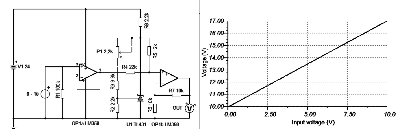 2. Nem tudni számodra mi az egyszerű, mert nem a 24V-ot kellene leosztani, hanem az y=ax+b képlettel egy egyenest 0..10V-ot 10..17V-ra konvertálni, ha jól értem. Ahol az a=0,7 és b=10. Maximum a 24V táp áll rendelkezésre.