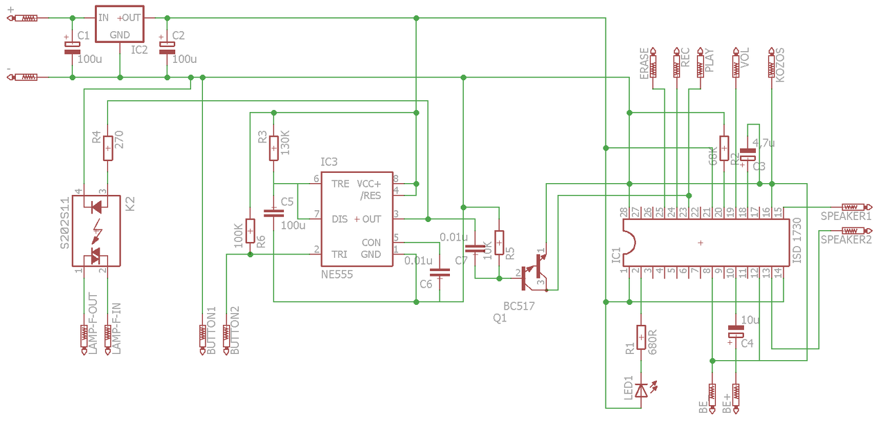 Ha igazán elegáns jelet akarsz az ISD-nek adni akkor az 555-ből kell még egy ugyanilyen kapcsolás de akkor a következő 555 -ös 2. lábára egy kondenzátoron keresztül vezeted a jelet az előző 555 3. kimenetéről .A második 555 3. kimenete meg egy ellenálláson keresztül a tranzisztor bázisára. Az RC tagok itt kisebb értékűek.