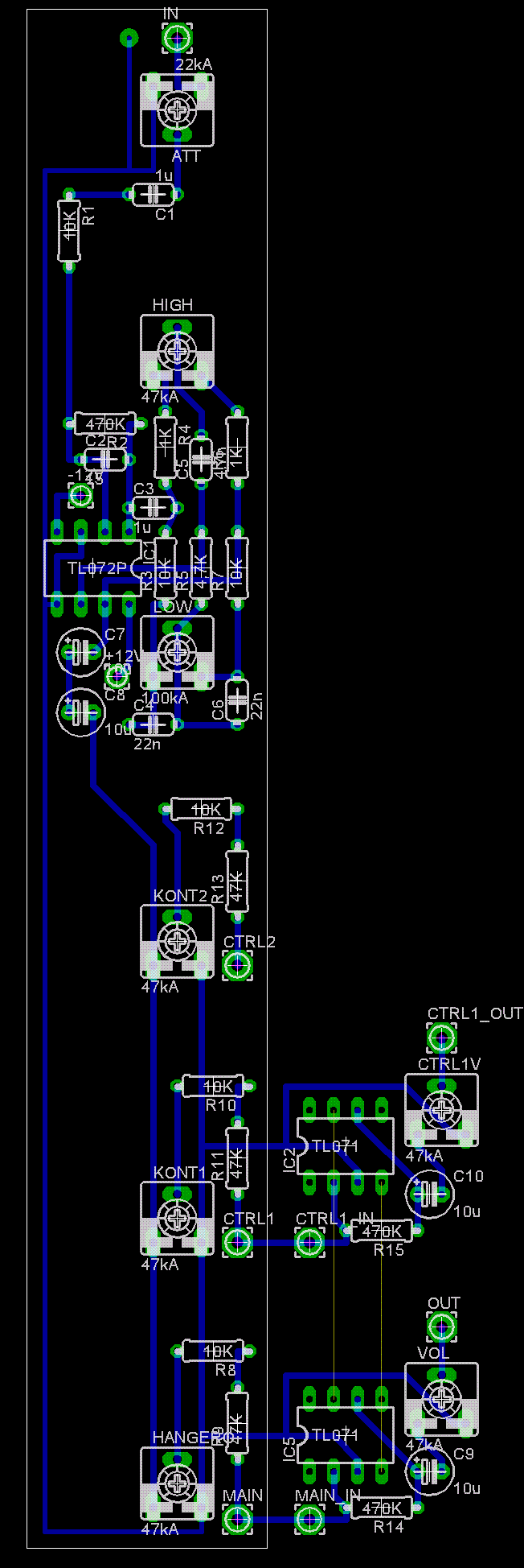 - Jól alakítottad át, csak ha nincs "pan" poti, akkor minek van a 10kohm és 47kohm sorbakötve? Semmi értelme nincs elég egy 47kohm-os ellenállás is. - Azért köti össze a lábait, mert a TL071-eknek nincs a tápfesze bekötve, és azt jelzi. Mivel ezek az IC-nek azonos lábai (4-4, 10-10, ezért látszik úgy mint ha a gumivonal összekötné saját lábait. Amúgy a nyák rajza jó, azt kivéve, hogy a GND vezetéket sokkal vastagabbra készíteném. Ha a C7-C8 szembefordított két kondi, akkor a C10 miért nincs ugyan így kialakítva? üdv! proli007