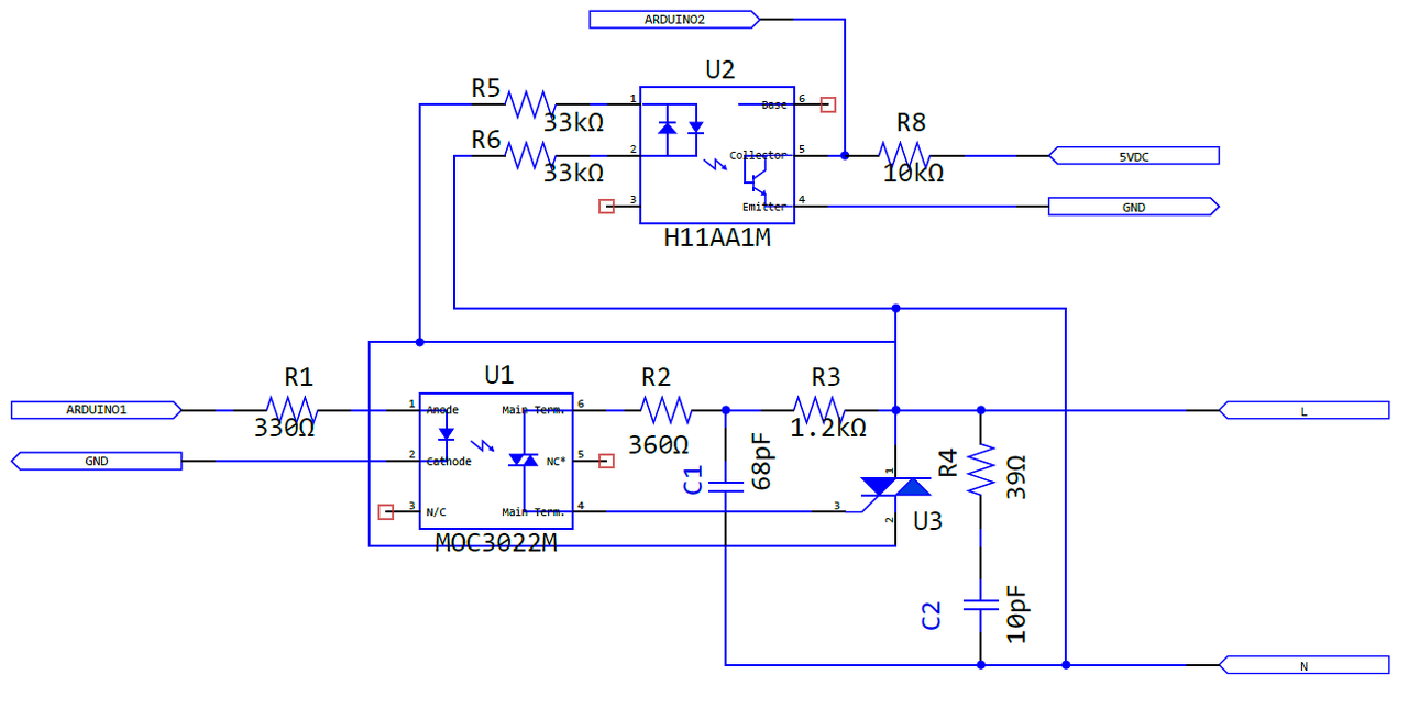 U1 - MOC3022M U2 - H11AA1M U3 - BT136-600E R1 - MF0207FTE-330R R2 - MF0207FTE-360R R3 - MF0207FTE-1K2 R4 - MF0207FTE-39R R5,R6 - MOF3WS-33K R8 - MF0207FTE-10K C1 - CCH-68P C2 - CCH-10P Nem tudom miért, de kimaradt az R7-es. Majd kijavitom. Esetleg le tudod ellenőrizni Peter hogy minden jól lett-e kigondolva?