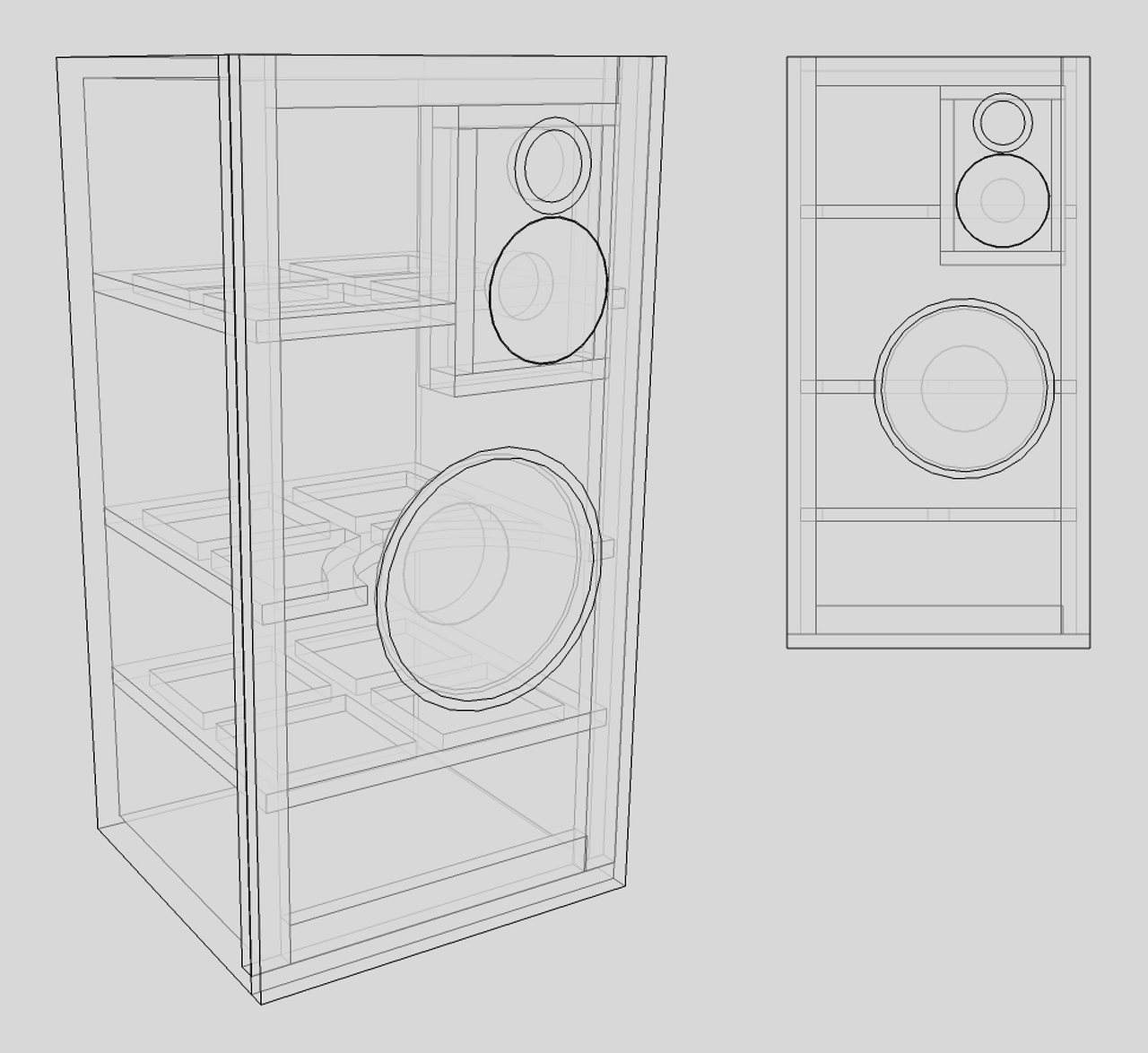 A Nokiát kipróbáltam egy kis dobozban, és kelleni fog mellé egy magassugárzó is (tudom, gyakran járok majd a hangváltós topikba...). Valószínűleg egy hátulról zárt papírmembrános lesz, de nem akarom a méllyel közös térben elhelyezni, így a Nokiával együtt zárnám el (nettó ~1,5 l-es térrészbe). A merevítéseket 18-19-es pozdorjából/bútorlapból tervezem, 30 mm-es "sávokkal", lekerekített kivágásokkal (a képen szögletesek). A SAL-t a doboz függőleges közepétől 5 cm-rel toltam el lefelé. A középső merevítés a SAL középvonalában van, a másik kettő pedig az így létrejött két térrész közepén. A merevítések mellett a hangszórók elrendezésével kapcsolatban is bizonytalan vagyok. A két kis hangszórónak közelebb kellene lennie a nagyhoz? A terven a SAL és a Nokia membránpereme között ~95 mm a legkisebb távolság. A Somogyi és te is 2500 Hz-es váltást javasoltál. Feltételezem, ez határozza meg, mennyire kell közel lenniük egymáshoz. Ha közelebb kell kerülniük, milyen módon (kicsik lejjebb vagy a nagy feljebb)? Vízszintes irányban közelebb hozzam a kicsiket a nagy középvonalához? Csak a kicsik mozoghatnak, a SAL-t nem tudom a doboz széle felé tolni.