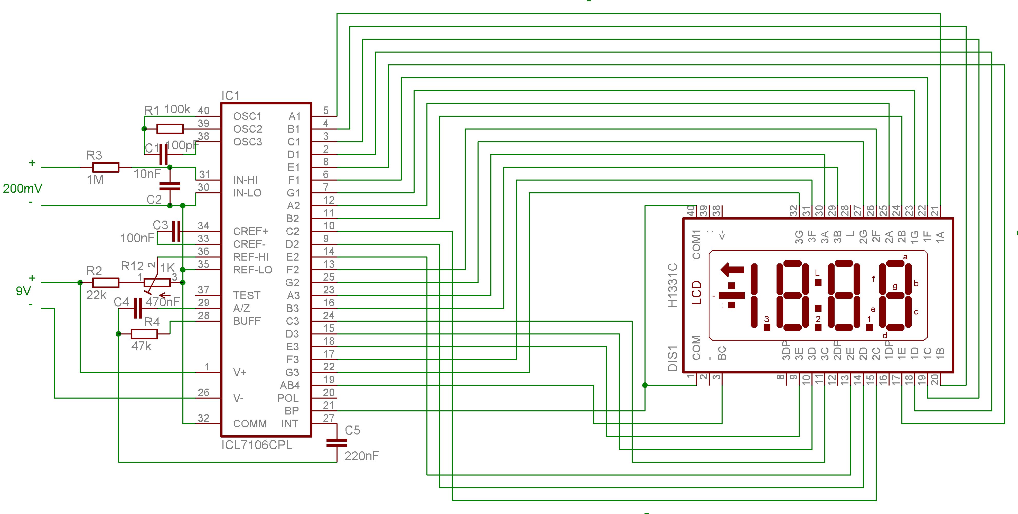 Nekem van 7106-hoz nyáktervem. Az IC-t a kijelző alá tettem így az egész áramkör csak akkora helyet foglal mint maga a kijelző. Az 1Kohm-os helitrimmer lábait kihajtottam és SMD-ként forrasztottam be. Természetesen ha más mérési tartományokat szeretnél egy feszosztóval ki kell egészíteni a bemenetet.