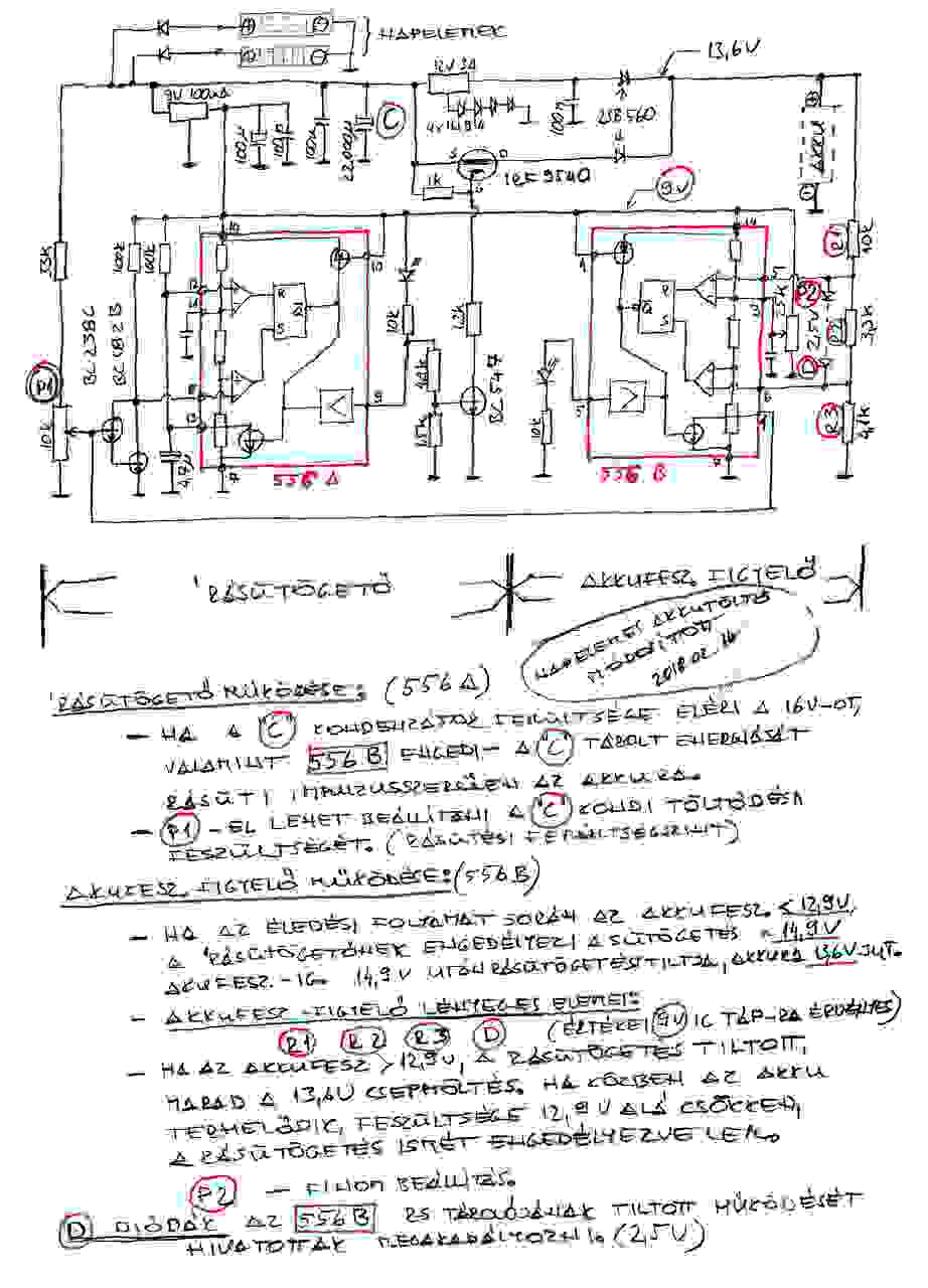 Töltés vezérlésére egy 555 időzítőt gondoltam beépíteni, kissé szokatlan kapcsolásban alkalmazva. Ő engedélyezné, vagy tiltaná a 'rásütögető működését 12,9 V - 14.8 V akkufesz függvényében. Kapcsolás, részletes működés elemzése a mellékletekben. Gondom, kérdésem: - az akkufesz. figyelőben az 555 trigg. bemenete éledés és működés közben trigg. jelként nem kötődik gnd. -re, csak a referencia feszültségszintje ( 9V tápnál 3V ) alá. Életképes ez így ??? Ilyen kapcsolással még nem találkoztam. - elhagyhatom- e a 12 V stabkocka, és az IRF utáni diódákat ? Az történik ekkor, hogy ezen alkatrészek éledés közben az akku felől magasbb feszültségszintet kanak, mint amire számítanak. Ha elhagyom, nyerek kb. 0.6 V- ot. Kérlek tisztelettel nézzél rá, részletek a mellékletekben. Tisztelettel