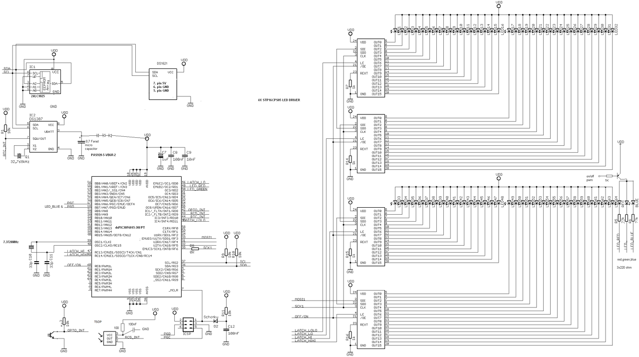 A rotor rajzban maradt egy kis hiba. A PIC 18-as lábán lévő ellenállás átkerül a külső kör tranzisztorának a bázisába. Itt az új rajz. A led áramkorlát ellenállások nálad változhatnak !!! (led függő) Kiegészítésként csináltam egy kis áramkört, ami minden órában egy percre bekapcsolja az órát. Ez egy kis dobozkában van, egy fix helyen ahonnan rálát az órára. Tulajdonképpen egy időzített távvezérlő, (a 16f84) ami csak a bázist kapcsolgatja ki-be. Nekem így működik, óránként egy percre megmutatja magát az óra. Ha érdekel küldöm.