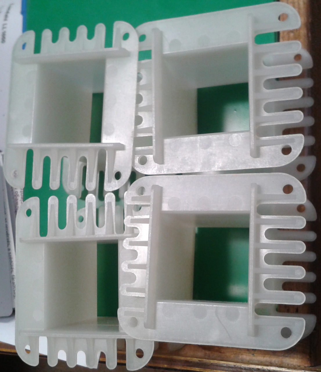 A következő 4 db kimenőhöz elfogyott a pr/szek közé használandó 0.12mm-es prespánom. Ezekre elég lett, de csak a sorszigetelésre használandó 0.05mm-es prespánból van bővebben. Ma vettem egy fajta, 0.1 mm vastag szigetelő fóliát. Áttetsző, nem víztiszta, inkább enyhén opálos. Őszintén szólva, nem tudom a pontos típusát, motortekercselő kollégától vettem, villanymotorokba biztosan használatos, a legrosszabb (Mylar) is 130 Celsiusig tud, de nem is ez a kérdés, hanem a kapacitás. Kimenő nem fog melegedni, de 130 Celsiusig hálózatinak se illik. 100x160mm-es nyáklemez közé raktam a prespánból és aztán a műanyag fóliából, azonos vastagságot képezve a 0.05mm-es prespánból duplán. A prespán az adott mérésben 0.57 nF, a fólia 0.47 nF volt. Biztatónak tűnik és jobbnak, mint a prespán. Viszont ez nem tud átázni az impregnálószertől, de lezárni a sorokat széleken bizonyára megteszi. Majd beszámolok.