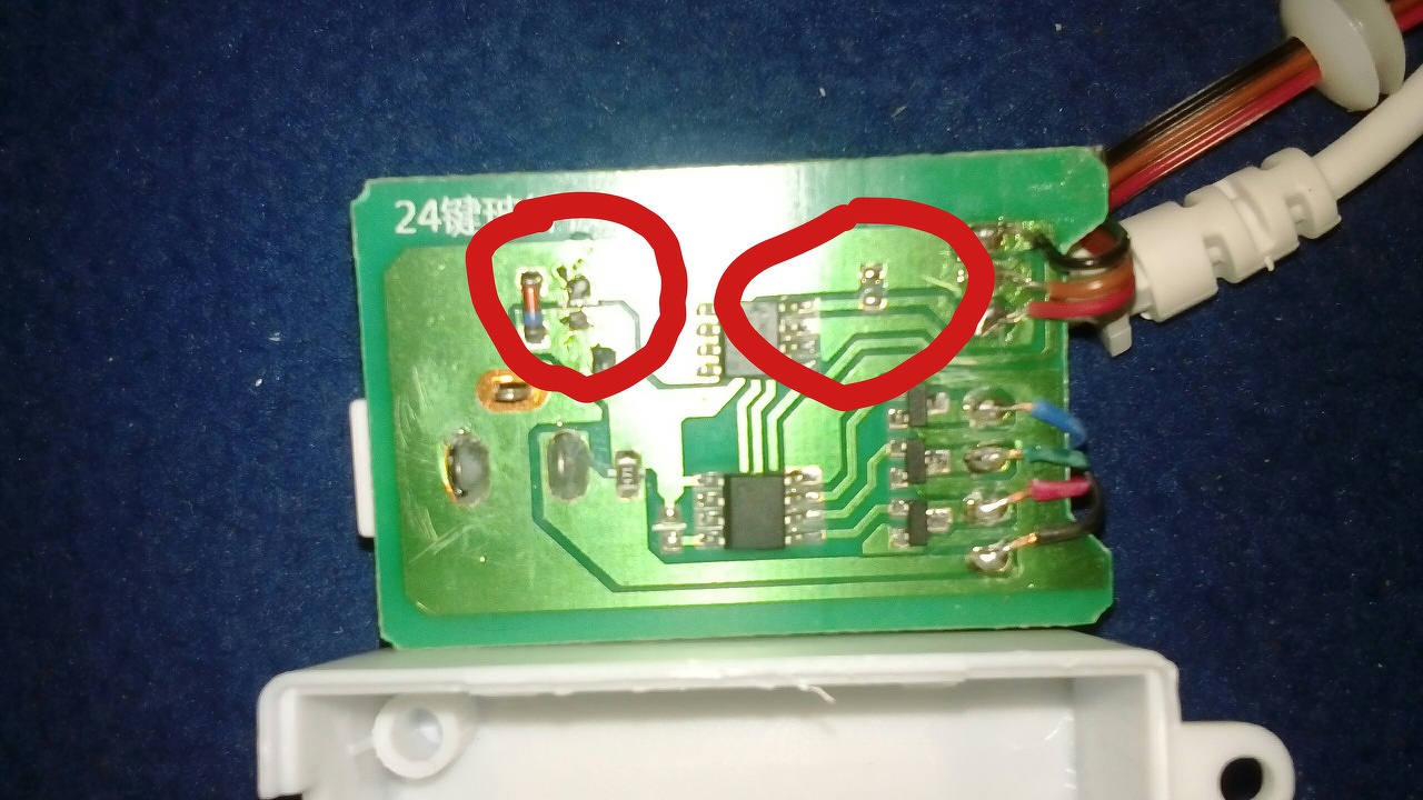 RGB Control Boxal lenne problémám. Beüzemelésnél kiderült hogy nem reagál a távirányító jelére. Maga a távirányító tökéletesen működik. Elkezdtem méregetni a panelját és a mellékelt képen jelölt pontokra helyezve a multimétert feszültségmérésben tökéletesen működött minden. Ezért gondoltam, hogy valami nagy ellenállást kell odatennem. Találtam is egy pár száz KOhm-ost odaérintettem a két ponthoz és úgy is működött minden, ám mikor odaforrasztottam ismét nem működött. Kiforrasztás után hozzáérintve ismét problémamentesen tette a dolgát. Ezt 2 másik ellenállással is megtettem ugyan ez volt az eredmény forrasztás nélkül ment forrasztással nem. Aztán találtam egy 2.2 MOhmos ellenállást amit beforrasztottam és szintén nem működött. És már a korábbi módszerek sem mennek. Elképzelhető hogy nem ellenállás kell oda hanem mondjuk kondnezátor? Vagy máshol lehet a probléma oka?