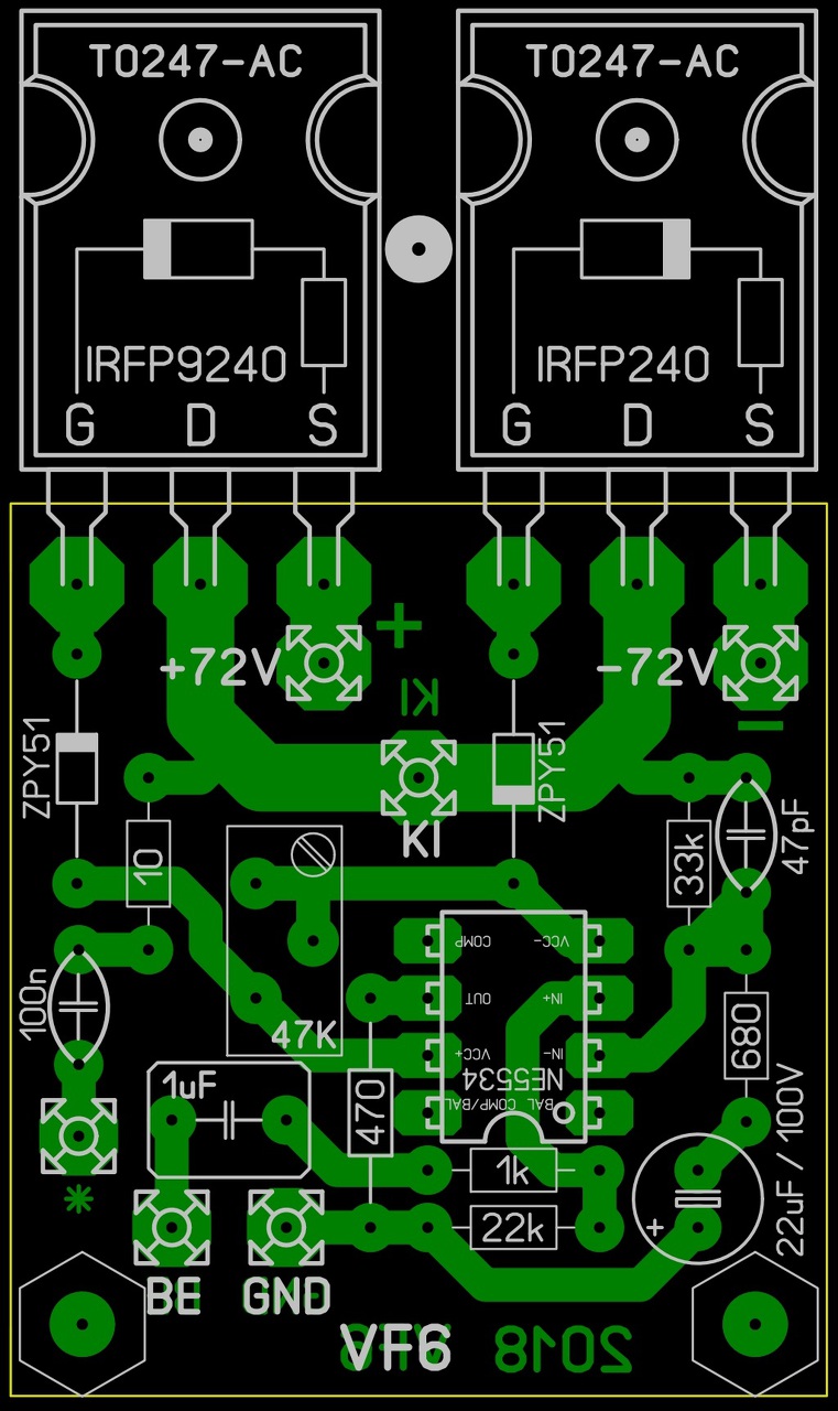 Gondolom csábító, hogy ez az ekkora teljesítményű erősítő ennyire egyszerű kapcsolással megvalósítható. Azért tartsd szem előtt, hogy a fetek és az opa tápja közötti különbséget a két zéner eszi meg. Ha stabil tápról járatod, akkor végül is nem jelent gondot a zéneres tápejtés, de ha közönséges tápról fog járni, akkorát eshet a végfok tápja, hogy elfog fogyni az opa tápfesze. Így nem tudja majd kivezérelni a végfokot. Ha nincs stabilizált táp, akkor inkább a VF2.