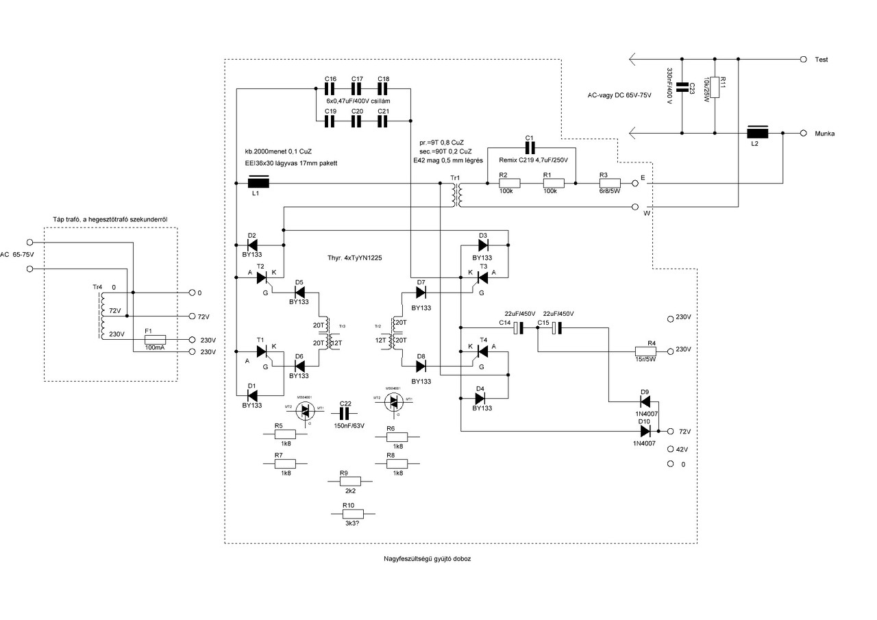 Ez is jó,de kell hozzá egy becsatoló trafó,mert úgy nézem az általad feltett rajzon,hogy a becsatoló trafó a régi gyújtóegységben volt. Alunál(AC üzem) a különbség csak annyi,hogy a nagyfesz folyamatosan megy hegesztés közben is, míg DC hegesztésnél csak az ívgyújtást segíti aztán kikapcsol.