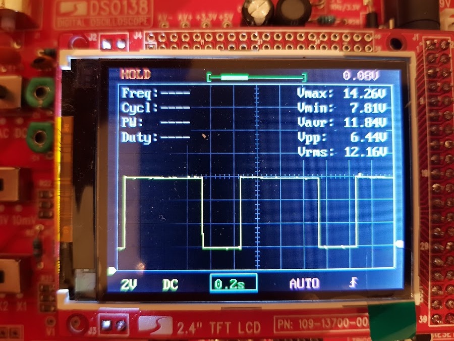 Mindenesetre amikor működik, akkor azt mutatja, hogy a FET gate-eken kb. 1 másodperciv -4 V (!) és +4V között kb. lineárisan nő a feszültség, majd akkor azonnal 20V-ra ugrik, és 1 másodpecig nyitva van, közben a fesz leesik 8-10V-ig, majd onnan hirtelen leesik -4 Voltra.