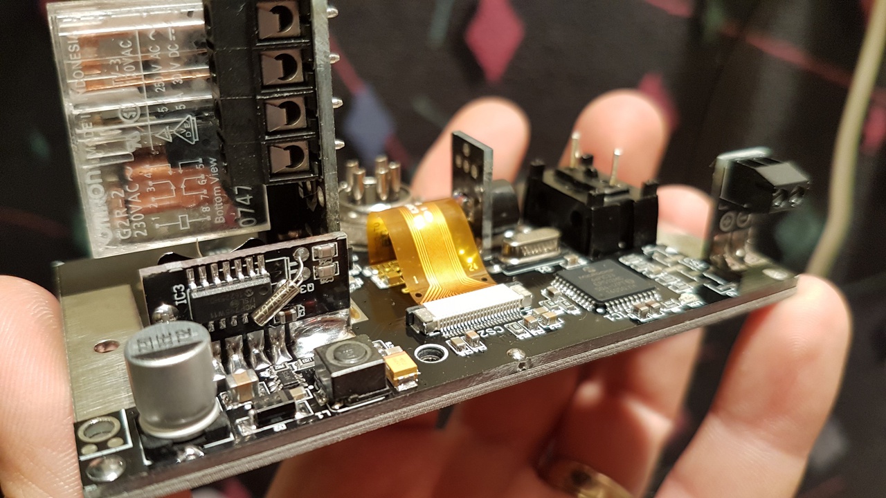 Ez még csak hardver, a szoftver sehol sincs és egy darabig nem is lesz időm megírni hozzá sajnos. Pár alkatrész még hiányzik a panelról. A kijelző egy 128x64 pixeles fehér OLED kijelző. Az előlapon (amely nyáklapból van) van öt kapacitív érintőgomb. A két nyáklap közti galvanikus kapcsolatot és egyben a két panel egymáshoz való mechanikai rögzítését forrasztással oldottam meg.A két panelt gyakorlatilag bizonyos pontokon össze lehet forrasztani egy-egy ónpacnival. Van az áramkörben egy RTCC is saját gombelemmel, hogy a páka készenléti módjában a pontos időt tudja kijelezni. Nem mintha ez fontos lenne, csak volt még hely a panelo(ko)n. A relé azért kell mert az előlapon lévő fizikai gomb megnyomásával az áramkör áram alá kerül (ráengedi a 230V-ot a tápra), és a gomb elengedése után a relé akasztja tartóra. Így meg tudom oldani azt is hogy ha a páka bizonyos ideig nincs használatban akkor nem csak hogy készenlétbe tudja majd helyezni magát a páka, hanem akár teljesen áramtalanítani is tudja önmagát. A merőleges panelokra azért volt szükség mert néhány alkatrész (piezo, helitrimmer, relé, sorkapocs, elemtartó) csak furatszerelt kivitelben kapható és a normál panelra (amelyiken a PIC is van) értelem-szerűen nem tehettem furatszerelt alkatrészeket mivel a panel túloldalán az előlap van. Az áramkört úgy terveztem meg, hogy gyakorlatilag bármilyen 24V-os pákát képes legyen működtetni. Első körben a Weller WSP-80 pákához készül, de a későbbiekben működni fog majd JBC T245-el vagy akár a sima Solomon pákával is. A tápja is rajta van a képeken a dobozon belül, az meg az Ebay-ről van fillérekért.