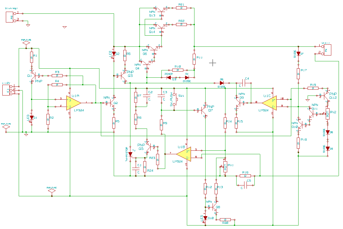 Ennek az előző verzióját (az említett ~42 tranzisztorost) megépítettem anno. Az annyira jól sikerült, hogy ~14A -ig (12V -on) "méltóztatott" kevesebbet változni 5mV -nál! Nem mintha szükség lett volna ilyen pontos cuccra, de a mérés ezt mutatta. A brumm is ebben a tartományban (<2mV) volt (~14A -nál). Áramkorlátot nem is terveztem bele eredetileg. De gondolkozom a dolgon. A Q7 bázis-emmitterből miért hiányozna egy ellenállás? Ha R9 megfelelően van kiválasztva, akkor egyszerűen ki fogja nyitni (és nem "kiégetni" ) Q7 -et (R9-C3 időállandó függvényében).Referenciaként nem tudom, hogy melyik LED -re gondolsz, de a D10 -es nem referencia céljára van ott, hanem az áramlimit bekapcsolását (és benntartását) hivatott jelezni. Emellett persze nyitja Q8 -at, amivel kényszeríti az LM324 7 -es kimenetét (U1B műv.er.), hogy maradjon alacsony szinten. A D2-R6-Q3 az áteresztő-darlington rész számára biztosítja a teljes kinyitáshoz szükséges bázisáramot. A D1 -es LED tényleg a "fő-referencia" alapja. A környezetével együtt egy számomra bevált kapcsolásként funkcionál. Mit értesz "valamire való referencia" alatt? Alapvetően két dolog miatt LED és nem zéner: 1. a LED -ek karakterisztikája meredekebb szokott lenni, mint egy általános zéner -nek, ebből kifolyólag a szabályzás is jobb lehet. 2. a LED -ek visszajelző/ellenőrző funkciót is betölthetnek Abban tökéletesen igazad van, hogy az R16 -on eső feszültséget még kompenzálni kellene. A hőfokfüggés nem olyan túl veszélyes, de vannak 5leteim, hogy mivel lehetne a meglévőt is valamennyire kiküszöbölni. Alkatrésztemetőt azért nem mondanék rá (a ~42 tr. -os verzió ismeretében ), de értem hogy mire gondolsz. Az áramkörtervezés egyik alapgondolata az szokott lenni nálam, hogy abból építkezem amim van! Alkatrészem pedig van bőven!Viszont azt nem értem, hogy miért kértél "bocsánatot". Konstruktív hozzáálláson nem feltétlenül szokás megsértődni. (legalábbis ha lehet, akkor próbálom tartani magam ehhez) ![]() Leginkább a "több szem többet lát" elv miatt tettem a rajzot fel. Vaxx>