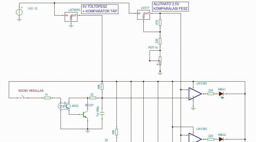 Ha a kocsi újra jelet ad, kisüti a konenzátort, aminek feszültsége letörik, a komparátor komparálási szintje alá csökken, a kimenet billen 0V-ra, kialszik a hibajelzés.